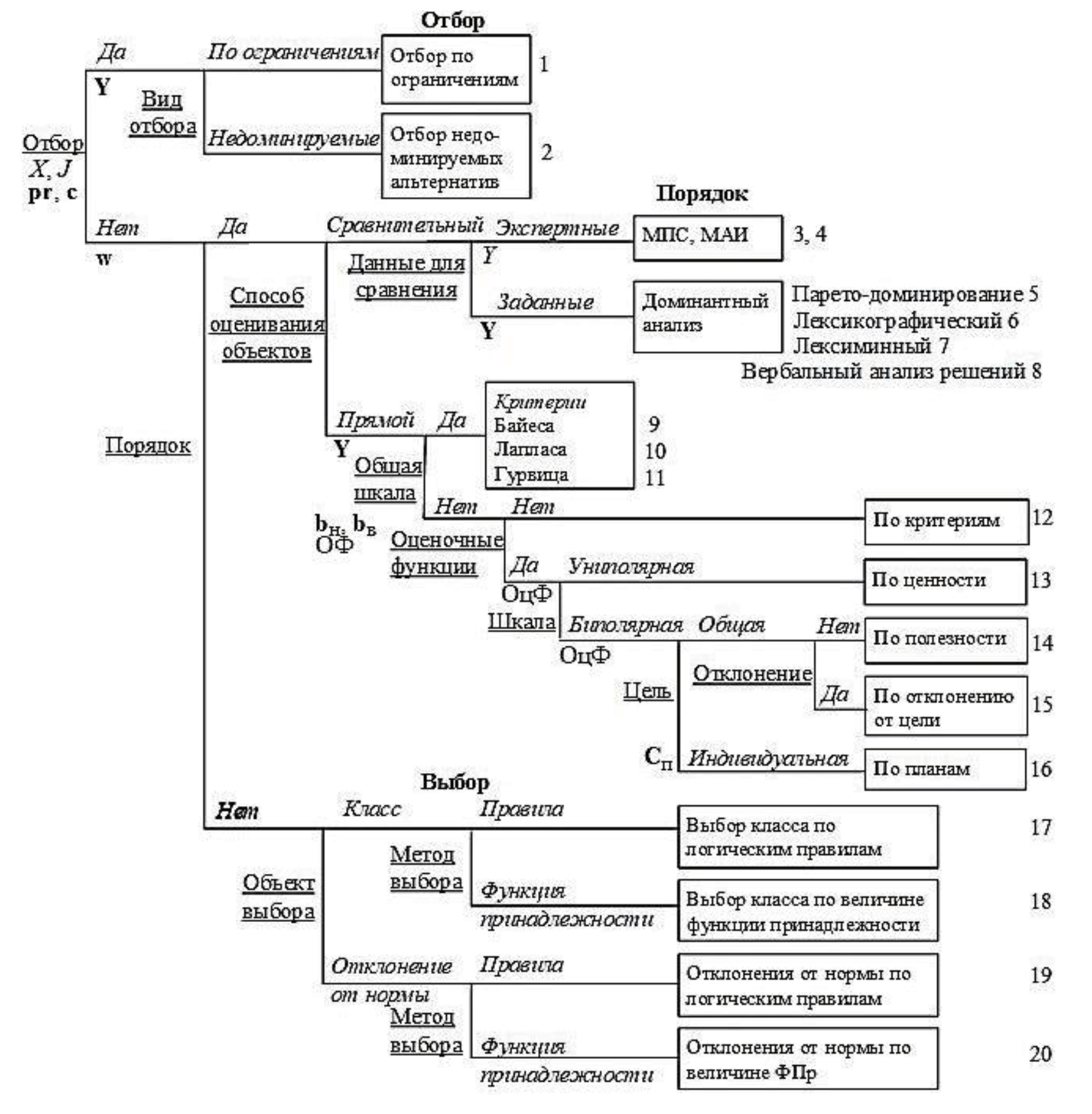 Развитие любой предметной области (ПрО) идёт в направлении увеличения количества решаемых задач и разрабатываемых для их решения методов и средств. Этому соответствует и научное направление «Выбор на конечном множестве альтернатив» (выбор на КМА), являющееся одним из разделов теории принятия решений. Для решения задач выбора на КМА в ранних работах были сформулированы два канонических подхода – логический и вычислительный. Логический подход базировался на сопоставлении альтернатив по экспертным оценкам характеризующих их показателей [1, 2]. В основу вычислительного подхода положен принцип вычисления оценок значений показателей, отражающих предпочтения лица, принимающего решения (ЛПР), с последующим обобщением полученных частных оценок. Основные теоретические результаты в этом подходе в виде теорий ценности и полезности получены во второй половине XX-го века [3-5].