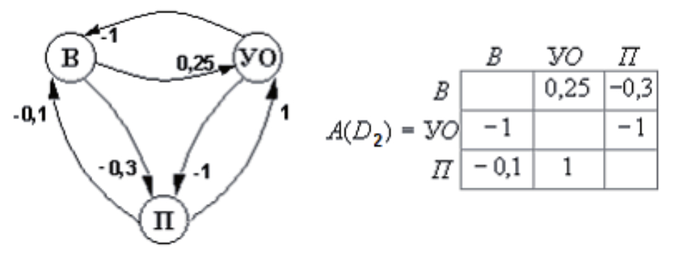 веса, что приводит к взвешенному орграфу. Такой вес интерпретируется как относительная сила воздействия и может быть положительным (для усиливающих воздействий) или отрицательным (для ослабляющих воздействий). В качестве примера на рисунке 2 показан взвешенный орграф D2, построенный путём преобразования знакового орграфа D1 (см. рисунок 1). Веса орграфа D2 определены на основе эвристических предположений об общих закономерностях процесса АО.