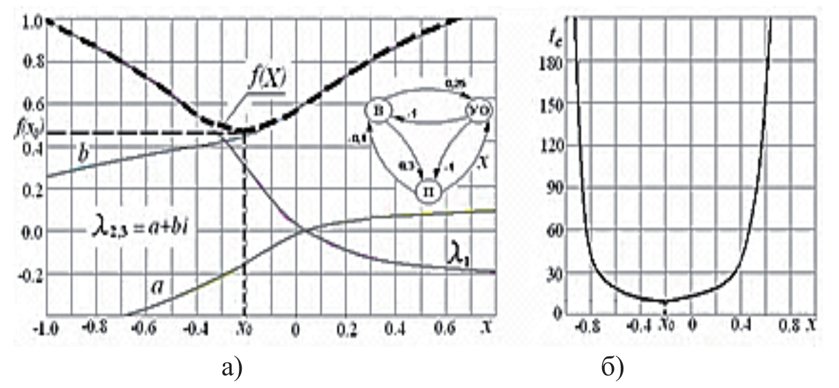 В качестве примера рассматривается трёхзвенный орграф (см. рисунок 2), в котором веса дуг представлены вектором X = (x1, x2, x3, x4, x5, x6) и зафиксированы первые пять переменных вектора Х = (0.25, 0.3, -1, -1, -0.1, x). Варьируя весом дуги (П, УО) x в диапазоне [-1, 1], можно построить графики изменения целевой функции f(Х) задачи оптимизации (8) и компонентов матрицы собственных значений А′: действительного собственного значения λ1 и величин a и b - составляющих комплексных собственных значений λ2,3 = a±bi, (рисунок 5).