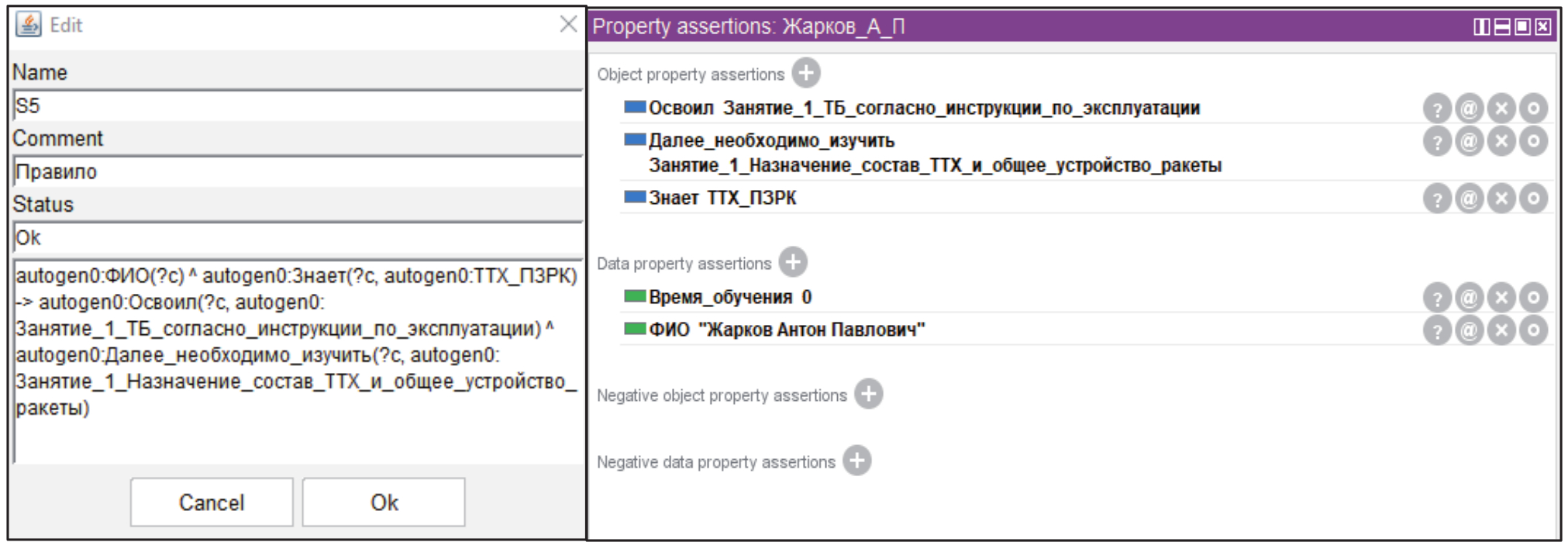 Для автоматического обновления информации о пройденных этапах АП в разработанной метаонтологии сформированы правила на языке SWRL. Правила позволяют автоматически обновлять информацию о полученных каждым обучаемым знаниях и умениях в процессе АП и представлять информацию (перечень атомарных гранул знаний и умений) руководителю занятия об оставшихся этапах для каждого обучаемого группы.