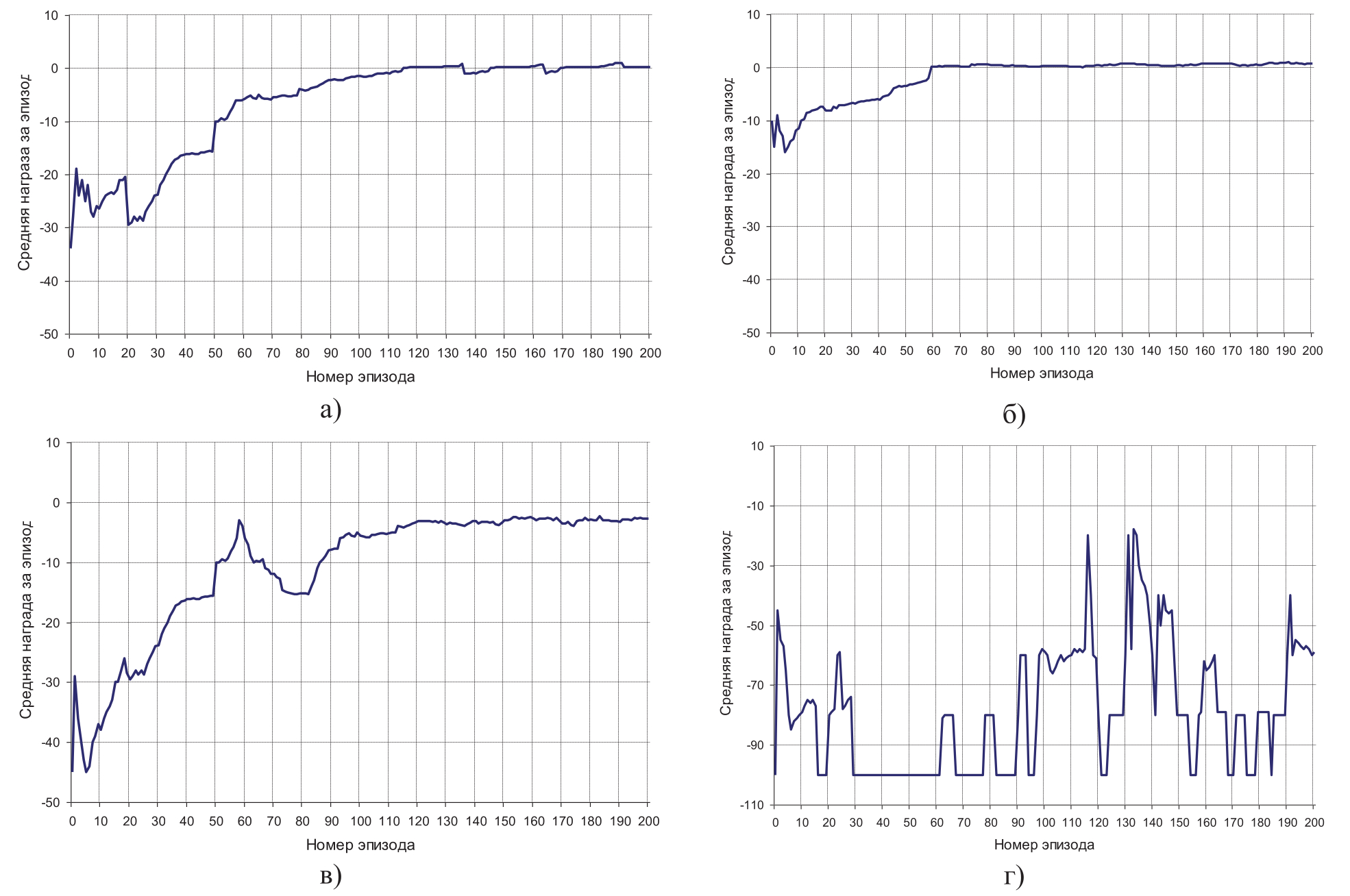 Алгоритмы оценивались по двум критериям – эффективность политики (средняя награда) и эффективность обучения агента (скорость сходимости). Значения средних наград рассчитаны за каждый из 200 эпизодов моделирования, осреднённых по 50 испытаниям. Наилучший результат показал алгоритм DDQN, обеспечивающий сравнительно быстрое обучение и положительную награду, таблица 4. Поэтому выработка ИТР в дальнейшем основывалась на DDQN-алгоритме.