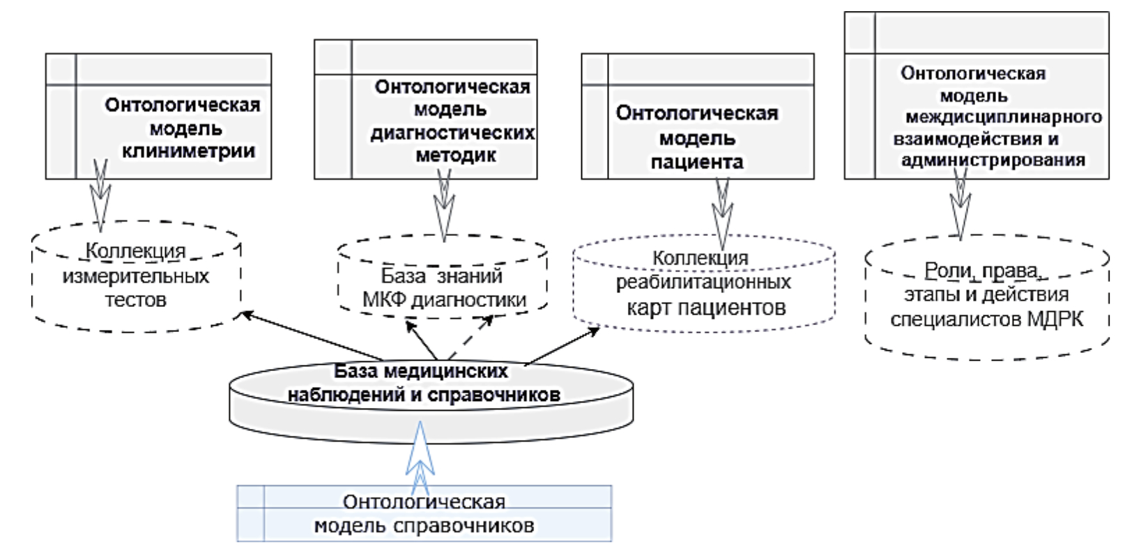 На рисунке 1 представлена схема разработанных ОМ, стрелками указаны их связи с целевыми ресурсами: базами знаний (БЗ) и данных, необходимых для интеллектуальной СППР при реабилитации.