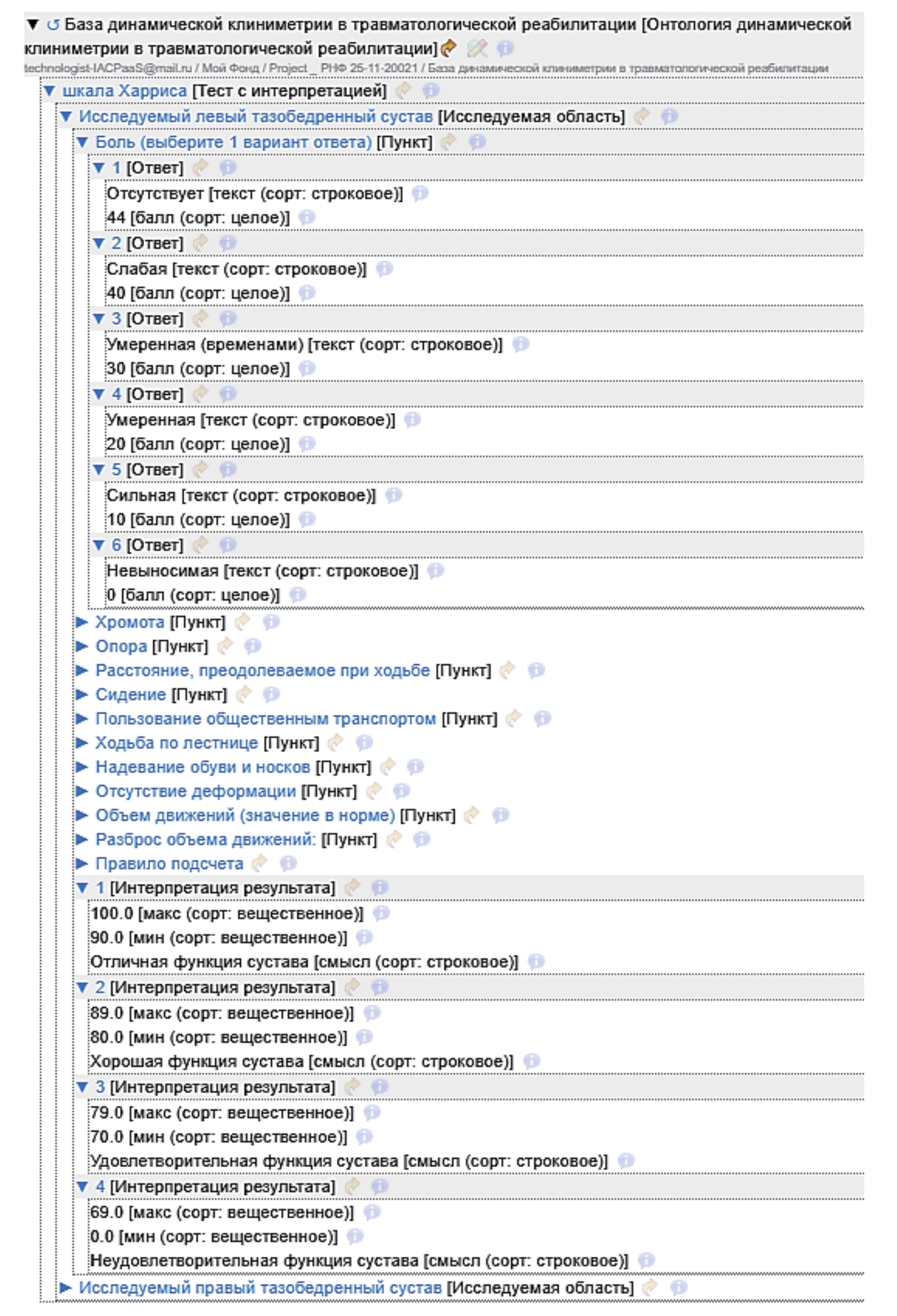 В данном примере это: Исследуемый левый тазобедренный сустав, Исследуемый правый тазобедренный сустав. Каждая порождённая вершина имеет идентичную внутреннюю структуру по причине единого онтологического «донора» (см. рисунок 5). Каждый вопрос шкалы соответствует онтологической структуре Пункт, в котором сгенерированы варианты ответов с текстовой их интерпретацией и бальным соответствием. Для каждой вершины внесены соответствующие правила подсчёта и логика интерпретации результатов.
