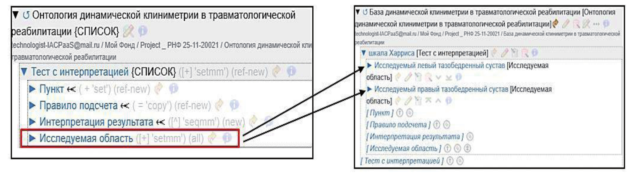 Учитывая необходимость исследования каждого сустава по отдельности, для формализации шкалы Харриса используются вершины онтологии: Исследуемая область, которая имеет спецификатор [+]setmm (пустое упорядоченное множество), что позволяет в целевом ресурсе генерировать некоторое множество необходимых вершин.