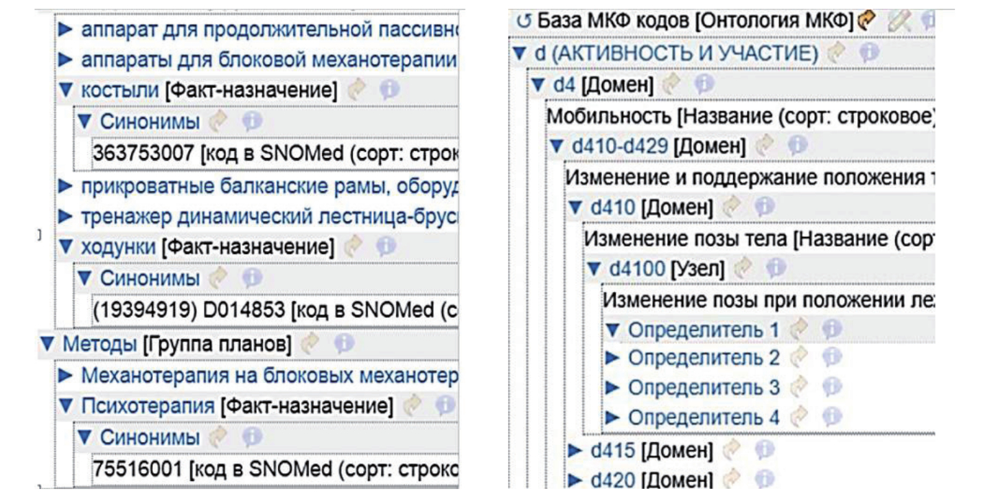 Справочники медицинских терминов отвечают современным требованиям электронного здравоохранения обширным содержанием с детализацией терминов-наблюдений состояния пациентов и с указанием международных названий и кодов терминов (в т.ч. SNOMED CT) для стандартизации медицинской документации (см. рисунок 7). В частности, в [11] представлена выборка приоритетных кодов и их описание по МКФ, которые необходимы при постановке реабилитационного диагноза у пациентов при патологии опорно-двигательной системы: изменение и поддержание положения тела (d410-d429); ходьба и передвижение (d450-d469); передвижение и использование транспорта (d470-d489); приобретение предметов первой необходимости (d610-d629) и др. Реабилитационный диагноз описывается в категориях МКФ, имеющих четыре уровня детализации нарушения структур, функций, жизнедеятельности и факторов среды. Интеграции со справочником помогает вложенная структура от метапонятия Домен до комплекса Определителей через Узел, представляющий код нарушения.
