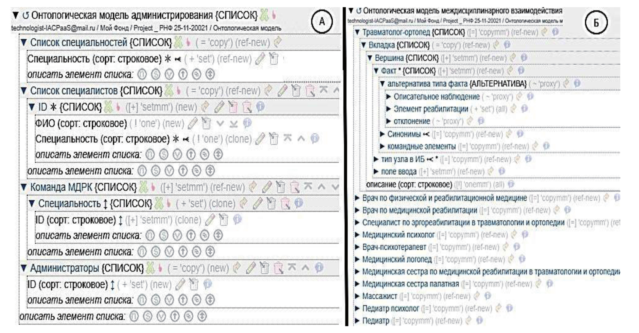 ОМ администрирования предназначена для координации между специалистами, сокращения ошибок администрирования и обеспечения открытости реабилитационного процесса в МДРК и представляет собой структуру, задающую формат хранения списка всех вовлечённых в реабилитацию участников с указанием медицинской специальности и принадлежностью МДРК. ОМ имеет следующие корневые понятия: список специальностей, список специалистов, команда МДРК, администраторы. Список специальностей организован как множество возможных специальностей, определяющих МДРК. Список специалистов реализован как множество ID, состоящее из ФИО (Фамилия Имя Отчество) и специальностей. МДРК включает множество пар ID и специальность. Администраторы – вершина, формирующая некоторое множество ID лиц, допущенных к принятию административных решений.