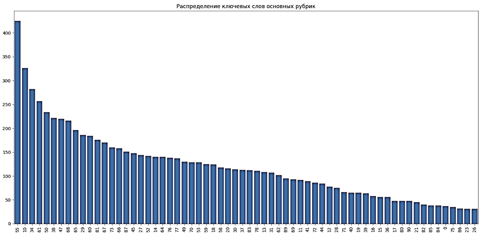 На рисунке 4 приведена иллюстрация распределения количества ключевых фраз по рубрикам верхнего уровня ГРНТИ (каждый столбец гистограммы соответствует одной рубрике ГРНТИ). Видно, что класс распределения ключевых фраз неравномерен – присутствует дисбаланс классов. В данной задаче это проявляется в склонности модели «игнорировать» малочисленные классы и чаще предсказывать рубрики, для которых в обучении было много примеров. Чтобы компенсировать этот эффект, применено взвешивание классов [15-17] при обучении моделей: меньшим по объёму классам назначаются повышенные веса ошибки.
