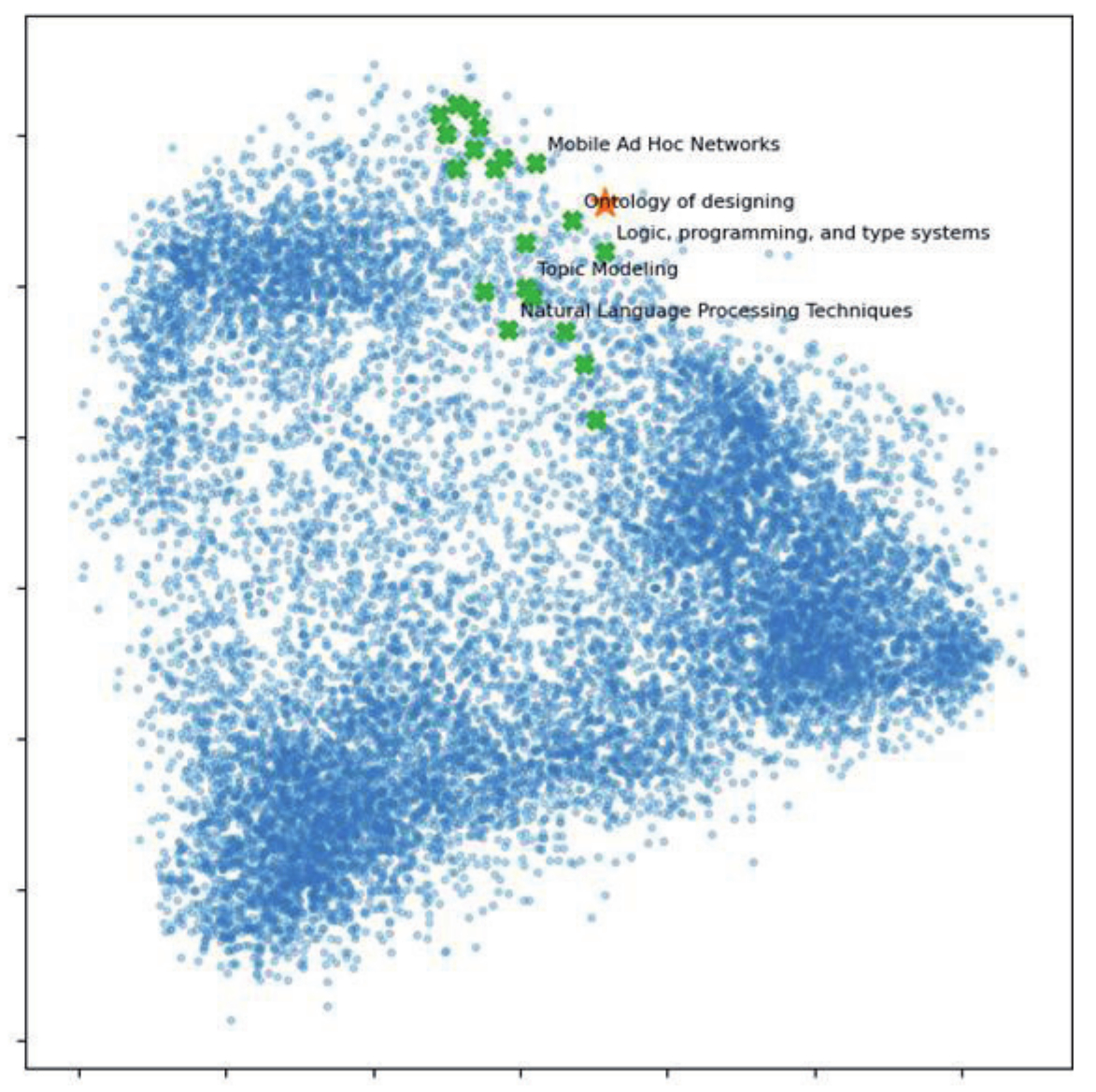 Близость запроса и ответов определяется на основе косинусного расстояния между запросом и результатами, который определяется выше некоторого порога k (на рисунке 6 k=0.7). Рисунок 6 сформирован автоматически путём преобразования эмбеддингов журналов в пространство размерности 2. Метод главных компонент находит два направления (главные компоненты, оси для визуализации), вдоль которых данные имеют наибольшую изменчивость, т.е. сохраняет максимум информации из исходного набора векторов. Все объекты проецируются на две оси. Полученные координаты используются для построения точек на плоскости, где каждая точка соответствует журналу из БС. Близкие точки соответствуют семантически близким объектам (крестики). На рисунке 6 запрос помечен звёздочкой, а соответствующие ему близкие журналы – крестиками. Это представление векторизованных данных на плоскости позволяет получить представление о том, насколько связаны данные, а также насколько близки результаты к запросу и между собой. Видно, что крестики сгруппированы в одной зоне векторного пространства и близки к запросу (звёздочке). Иллюстрации на основе метода главных компонент позволяют качественно оценить достоверность полученных оценок близости эмбеддингов запроса и журнала.