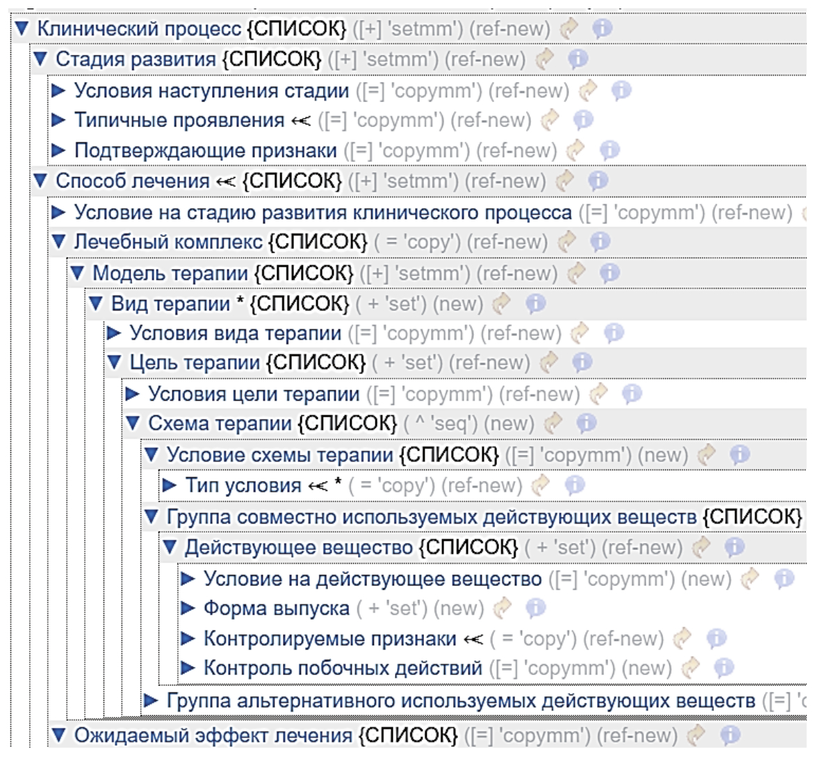 Таким образом, реализуется динамический контроль текущего клинического состояния пациента на фоне проведения медикаментозной терапии. Для оценки эффективности проводимой терапии в ГЗ лечения для каждого ЛС или их комбинации предусмотрен элемент знаний «критерии оценки эффективности лечения», согласно которому в данном клиническом примере формируется описание ежедневного контроля эффекта проводимой терапии через signNamejt = артериальное давление.