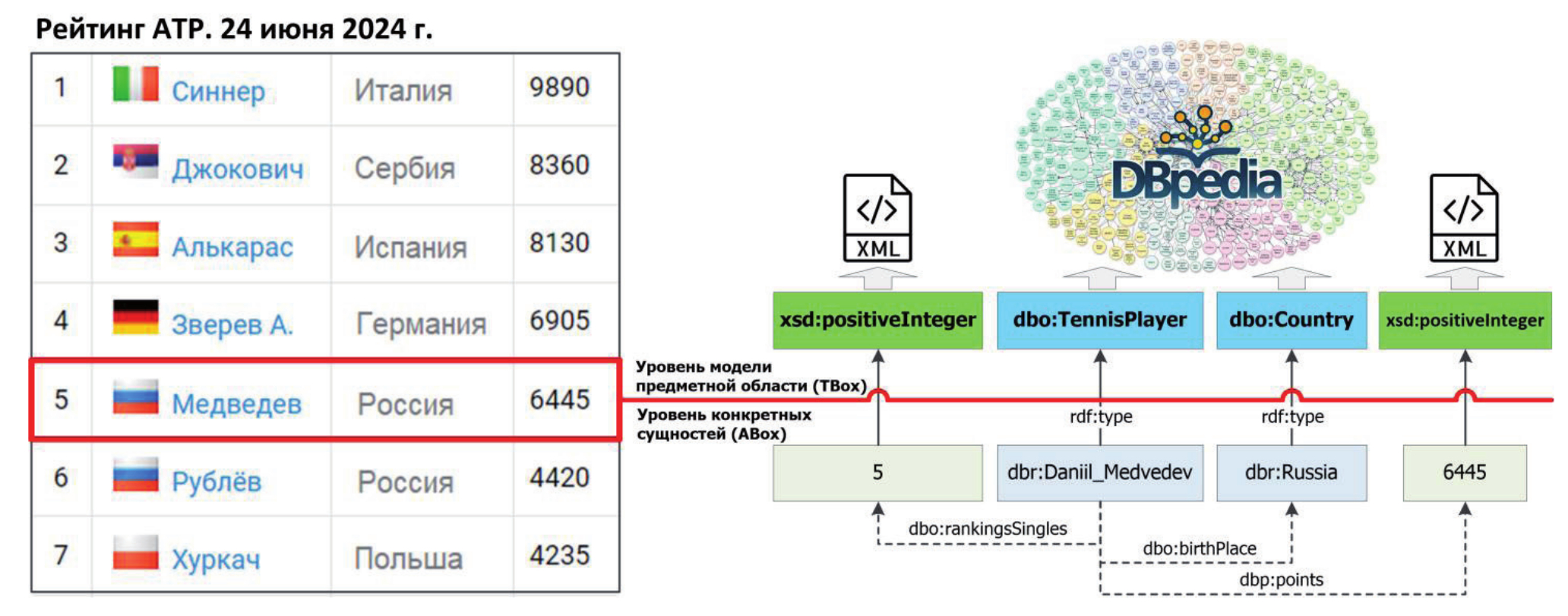 На рисунке 1 представлена схема, иллюстрирующая пример семантического аннотирования таблицы и извлечения конкретных сущностей (фактов) из её строки. В примере использована таблица международного рейтинга Ассоциации теннисистов-профессионалов (АТР).