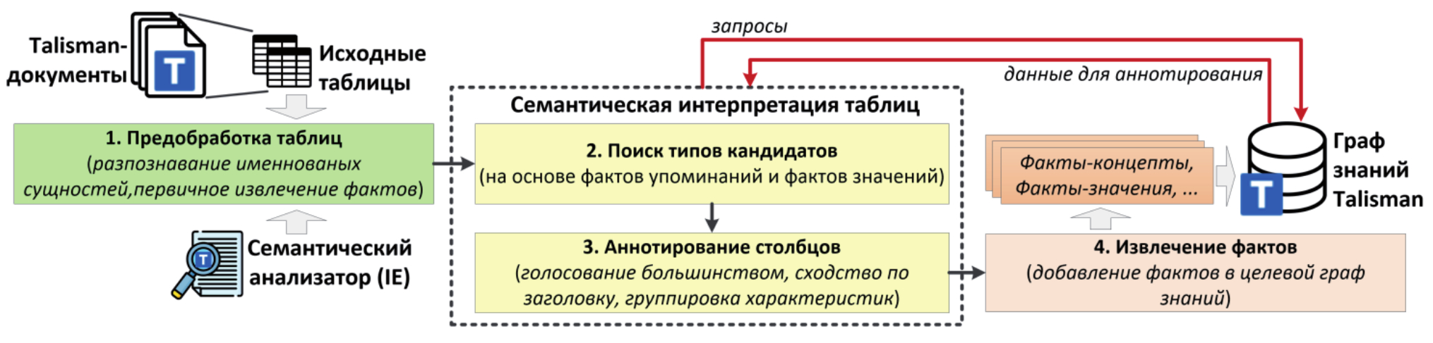 В статье представлен подход к автоматизированной разработке предметно-ориентированных ГЗ на основе семантического аннотирования ТД. Предлагаемый подход включает комбинацию эвристических решений для аннотирования столбцов таблиц и аннотирования отношений между столбцами. В качестве входных данных используются Talisman-документы, а в качестве ЦГЗ – ГЗ платформы Talisman. Подход реализован в форме специального модуля-обработчика «tables-annotator» для Talisman-IE.