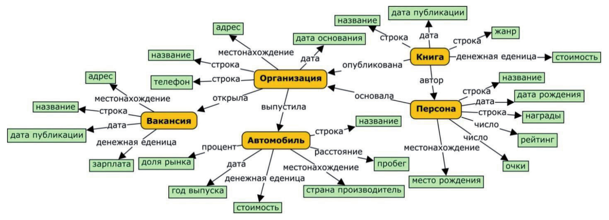Фрагмент модели ПрО, использованной в процессе семантического аннотирования таблиц и на этапе пополнения ТД, показан на рисунке 4. Данный ГЗ представлен в виде ориентированного графа, доступ к которому осуществляется с помощью интерфейса GraphQL37. В модели описаны основные типы концептов, такие как «Персона» (NER-метки: PERSON, PER), «Организация» (NER-метки: ORGANIZATION, ORG), «Вакансия» (нет соответствующей NER-метки), «Автомобиль» (NER-метки: PRODUCT) и «Книга» (NER-метки: WORK_OF_ART).