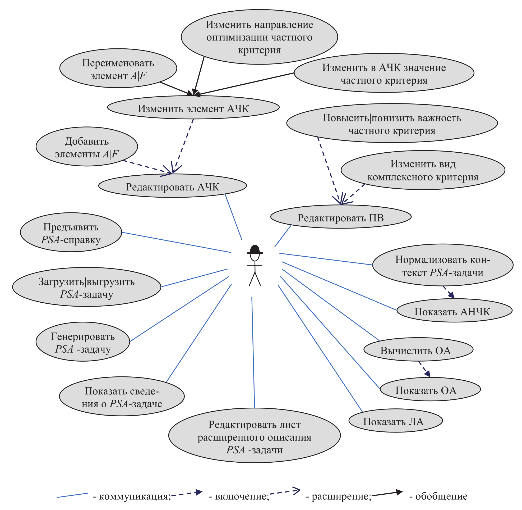 - 1 – формирование и редактирование соответствия «альтернативы – частные критерии» (АЧК), которое представляет собой основу многозначного контекста PSA‑задачи