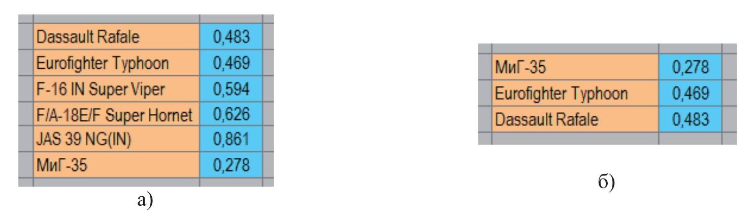 Полученные с использованием PSA-приложения МУС-оценки обобщённой эффективности всех самолётов, рассматривавшихся в тендере MMRCA, показаны на фрагменте скриншота листа «Верстак» на рисунке 8а, а рисунок 8б демонстрирует скриншот набора лучших трёх самолётов и их обобщённые оценки.