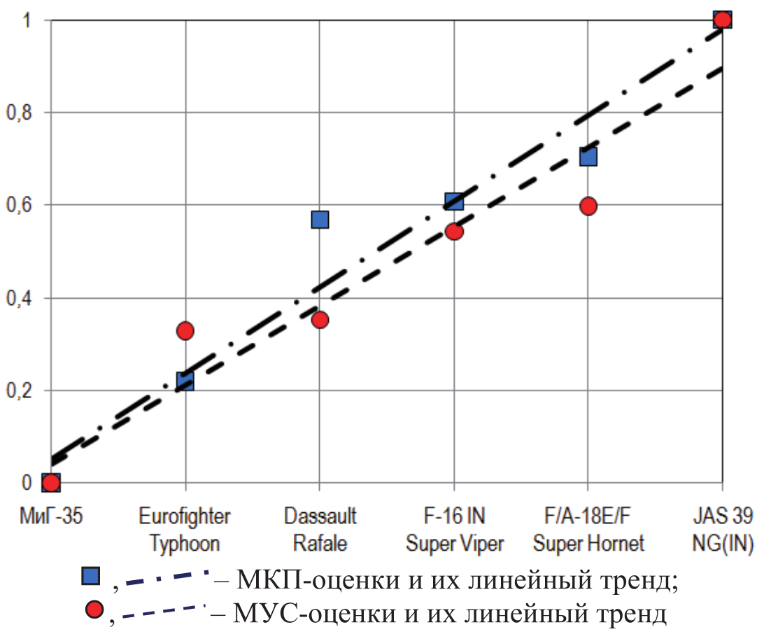 Рисунок 9 – Линейные тренды упорядоченных рядов оценок самолётов методами косвенных предпочтений и уверенных суждений