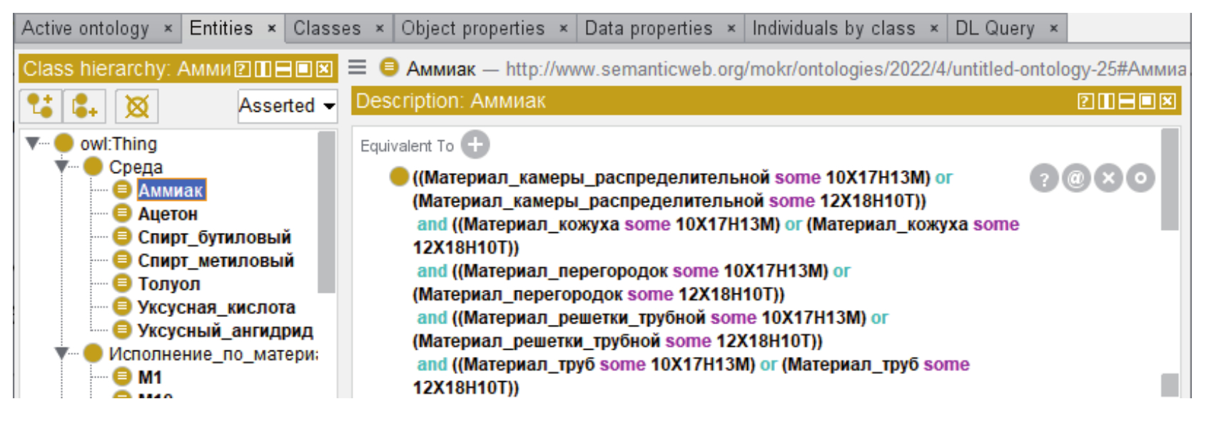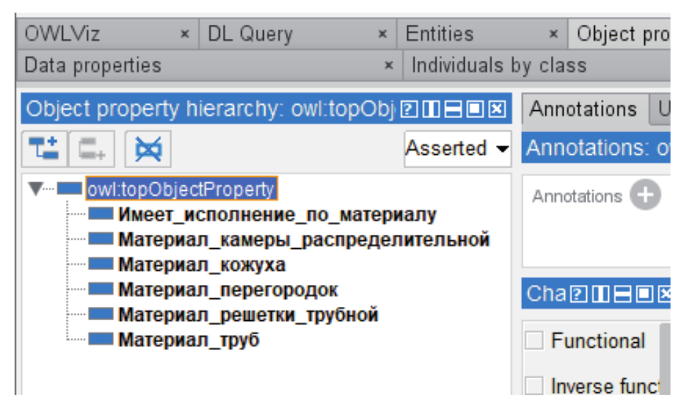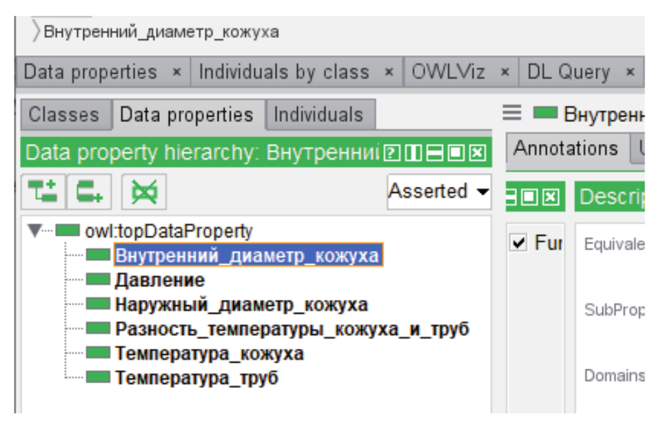 Основными классами сущностей (Classes) являются: Среда, Материал, Исполнение по материалу, Типы теплообменников (рисунок 6). Свойства объектов (Objekt property): Имеет исполнение по материалу, Материал камеры распределительной, Материал кожуха, Материал перегородок, Материал решётки трубной, Материал труб (рисунок 7). Данные (Data properties): Внутренний диаметр кожуха, Давление, Наружный диаметр кожуха, Разность температуры кожуха и труб, Температура кожуха, Температура труб (рисунок 8).