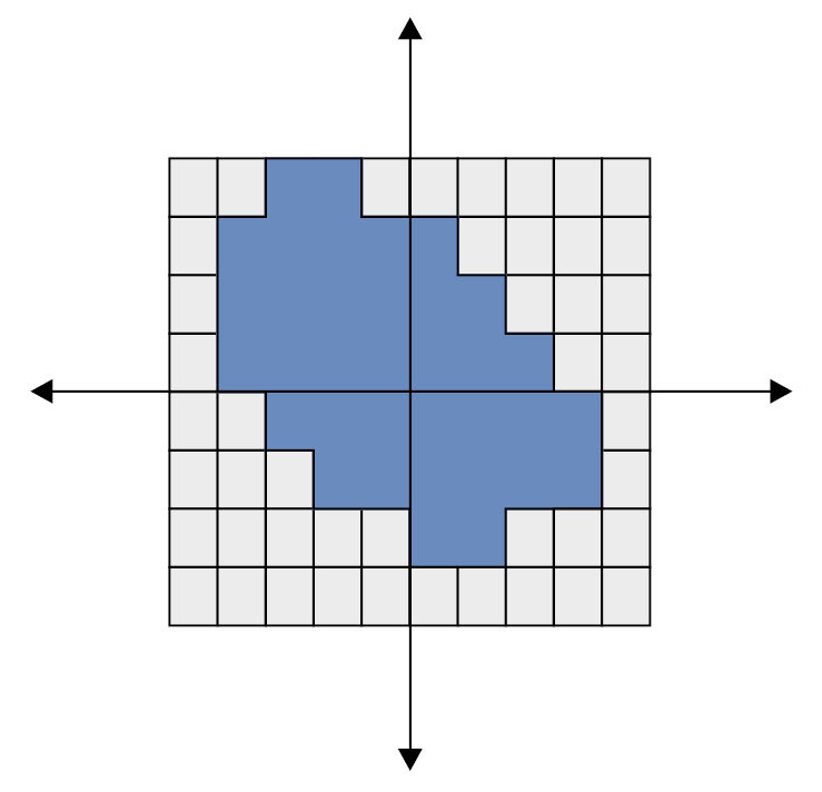 Рассмотрим модель произвольного творческого произведения на основе декартовой системы координат (рис. 1), где закрашенные клетки-ячейки представляют собой содержание того или иного фрагмента «интеллектуальной» деятельности. Смысловые связи между предложенными результатами неясны, это лишь отдельные, отстраненные друг от друга координатные ячейки. ИИ может обучаться на множестве стихов, произведений искусства. Он, возможно, даже обнаруживает связи между ними, чтобы правдоподобно соединить фрагменты, но не устанавливает их смысл, что мы и видели на примере с таблицей Менделеева.