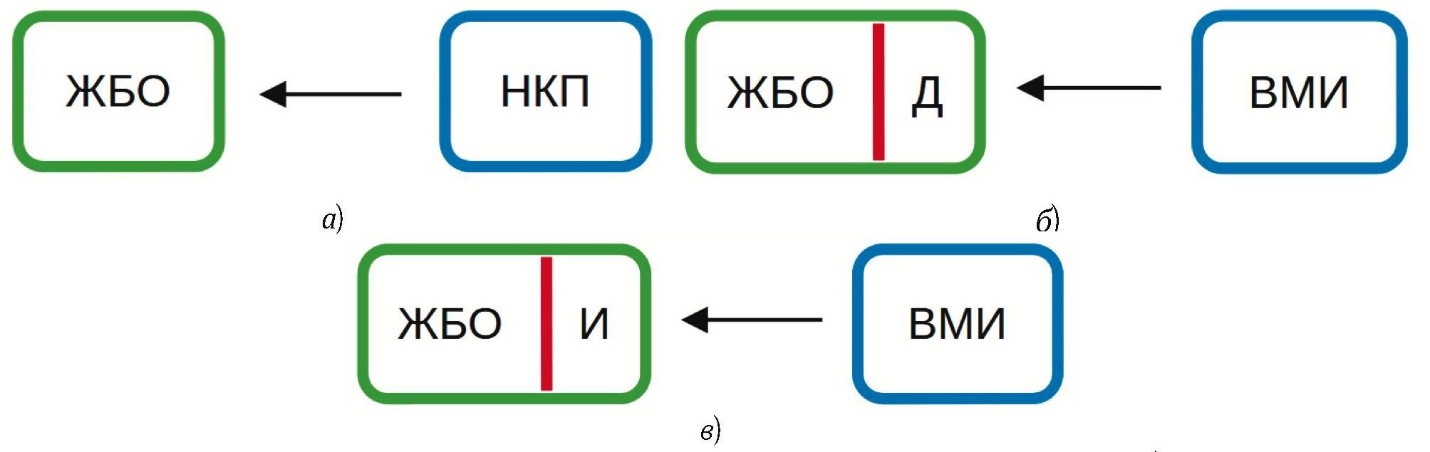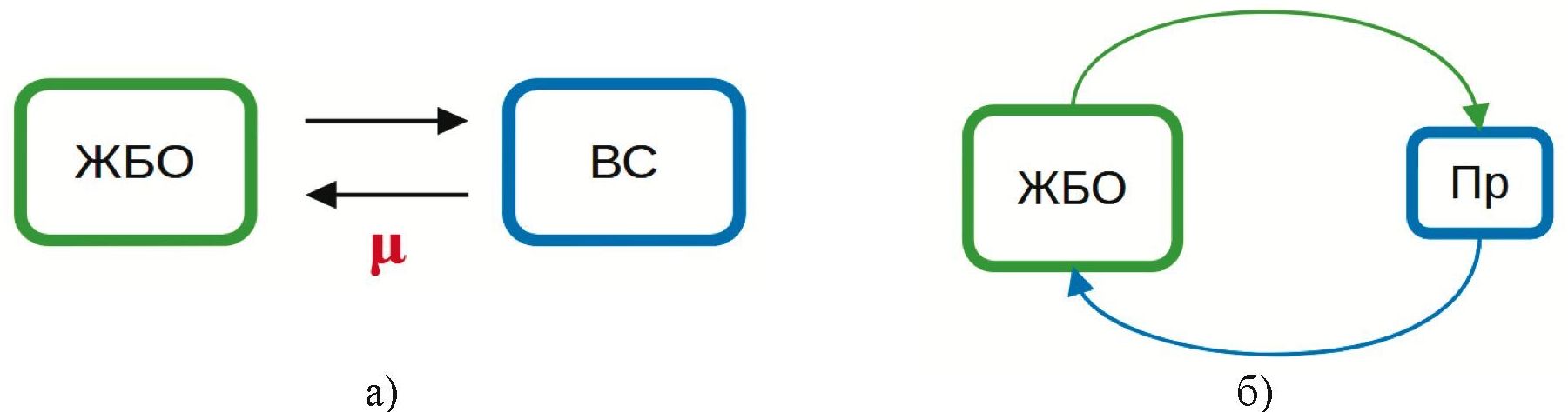 Рис. 2. Взаимодействие живого биологического объекта (ЖБО): а) с внешней средой (ВС); б) с преобразователем колебаний (Пр), порождаемых ЖБО.
