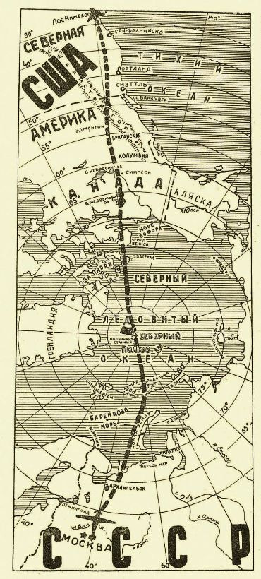 Рис. 4. Схема авиаперелета Москва – Северный полюс – Америка. М. Ильин. Сегодня и вчера. 1937