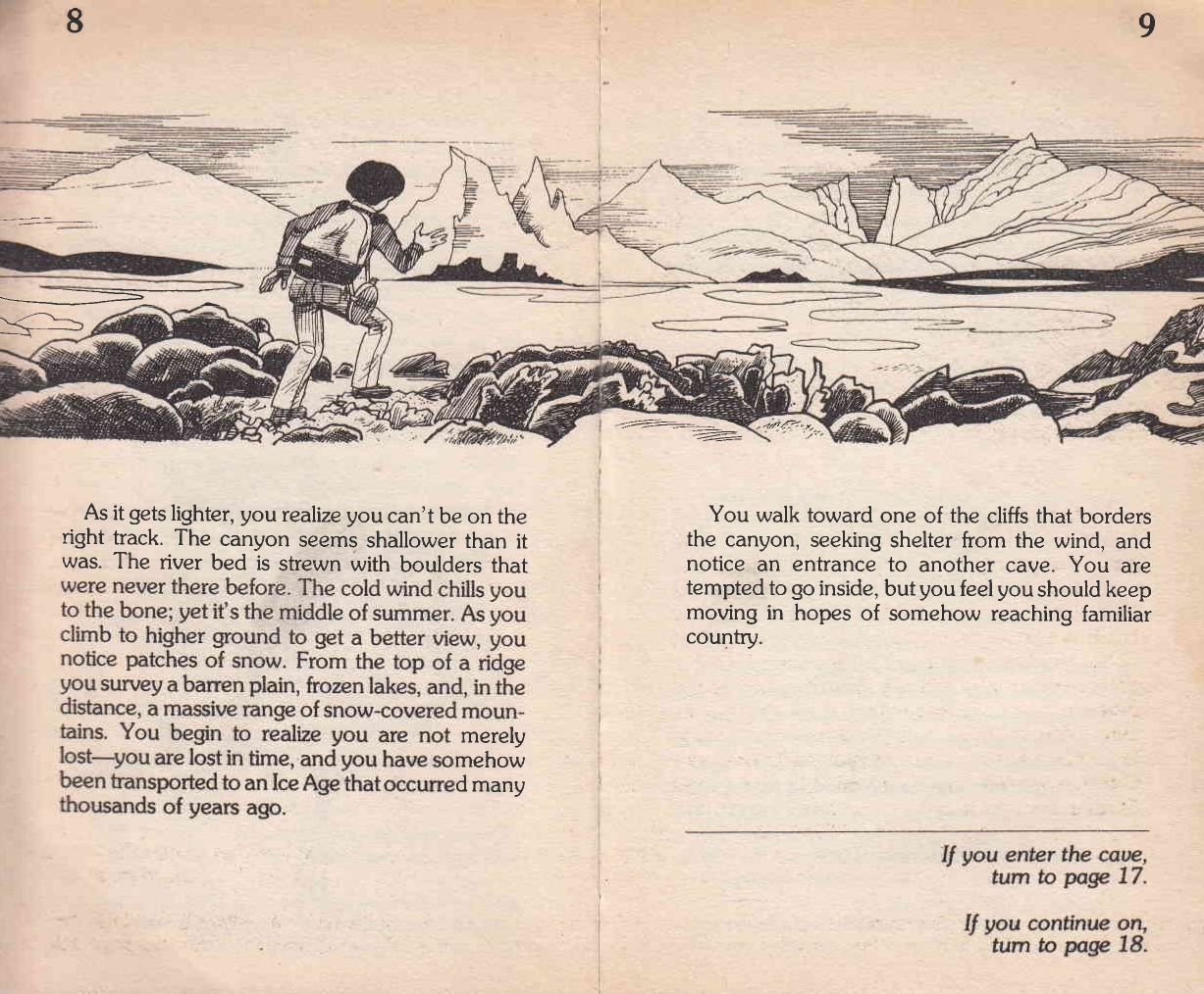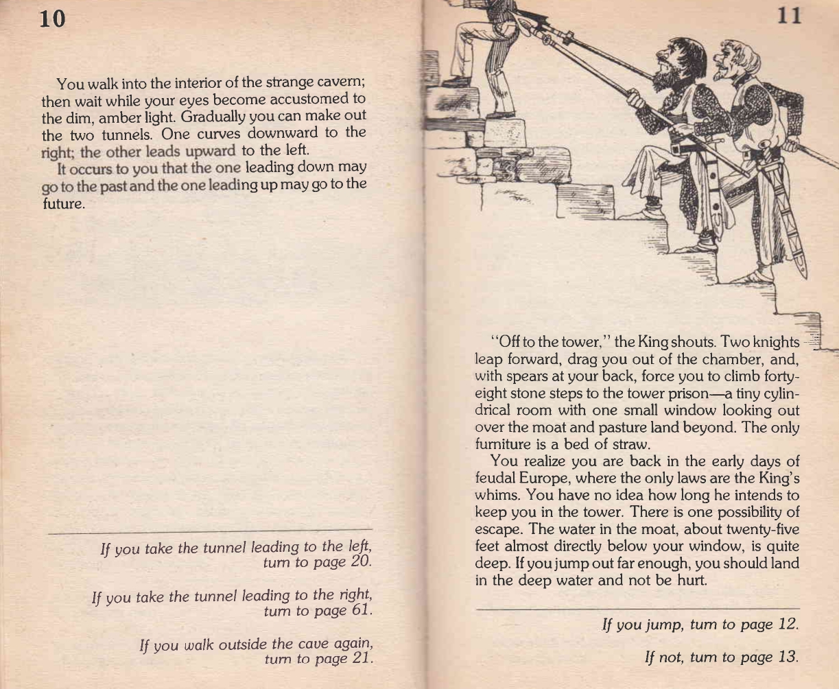Мы сконцентрируемся на нескольких книгах из серии ВСП, в которых пространство заявлено уже в названии. «Пещера времени» и «Путешествие на дно моря» выходят в 1979 г., тогда как «Остров динозавров» или «Каньон разбойников» уже позже, в 1993 и 1992 гг. соответственно. Первые книги создаются Паккардом и Монтгомери и формируют стандарт всей серии, впоследствии воспроизводимый в более поздних книгах, в том числе в ее дополнительных «ответвлениях». Меняется среда, в которой читаются и «играются» эти книги, меняются их авторы, меняется и заочный диалог книг-игр с другими медиа (видеоиграми, кино). В этой статье, говоря о пространстве в книгах-играх и о взаимодействии с ним читателя, мы не будем подвергать анализу историческую изменчивость жанра книг-игр (и серии ВСП).