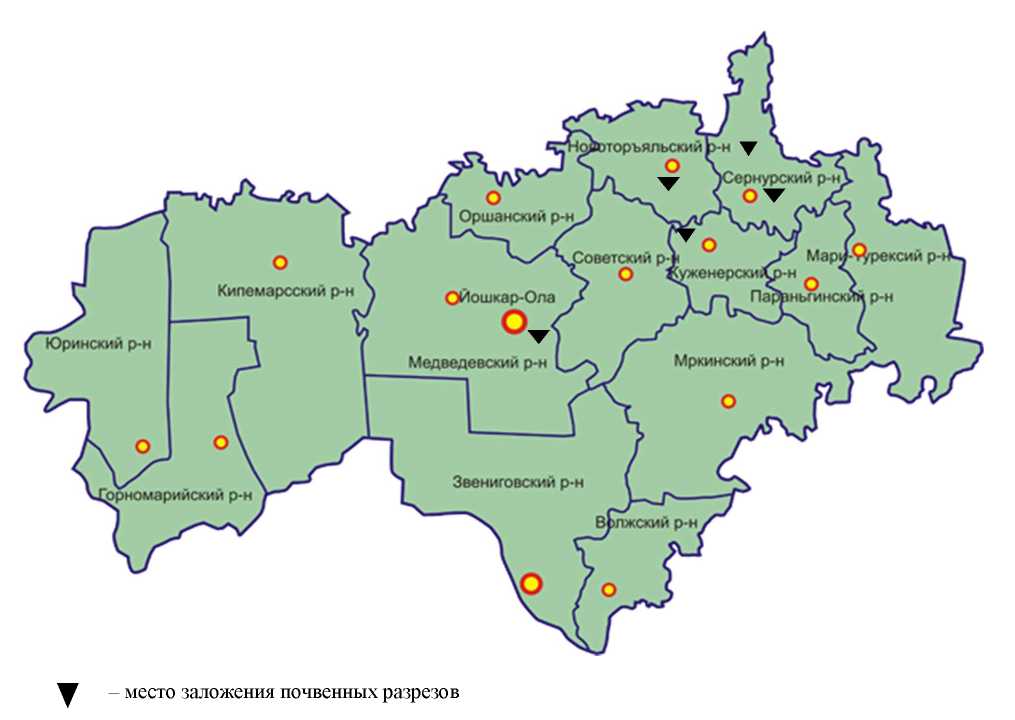 Рис. 1. Карта Республики Марий Эл. Места заложения почвенных разрезов (составлено автором)
