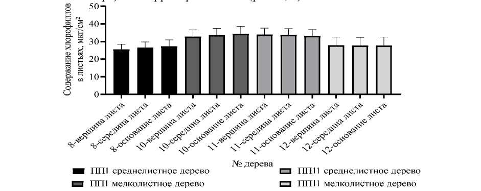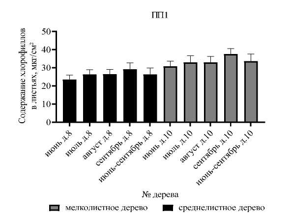 При сравнении содержания хлорофиллов у среднелистных деревьев берёзы (ПП1 и ПП11) установлено, что среднее содержание хлорофиллов в листьях (в период с июня по сентябрь) выше на территории СРЗ (ПП11).