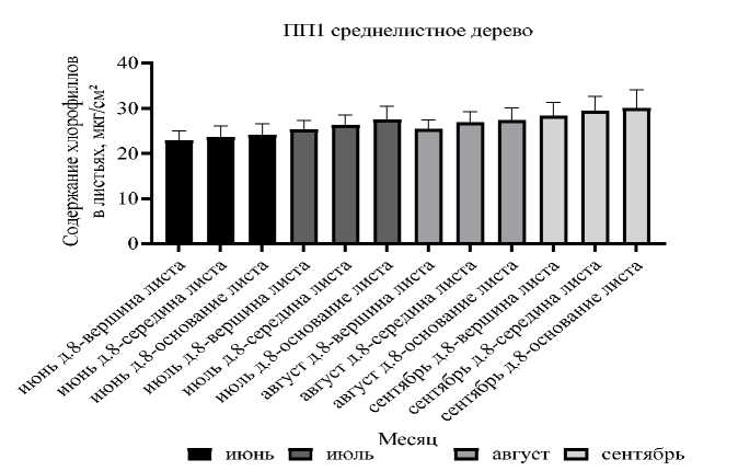 С июня по сентябрь содержание хлорофиллов в листьях берёзы на территории ПЗ (ПП1) у среднелистного дерева было выше в основании листьев (рис. 9). В период с июня по сентябрь содержание хлорофиллов незначительно увеличивалось.