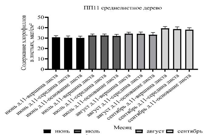Максимальное значение содержания хлорофиллов в листьях берёзы (в период с июня по сентябрь) на территории СРЗ (ПП11) у дерева № 11 (среднелистного) варьируется в диапазоне 33,9 – 42,5 мкг/см2. С июня по сентябрь содержание хлорофиллов увеличивалось и составляло 33,9; 35,6; 37,2; 42,5 мкг/см2, соответственно. Минимальное значение содержания хлорофиллов в листьях берёзы (с июня по сентябрь) на территории СРЗ (ПП11) у дерева № 11 (среднелистного) варьируется в диапазоне 25,1–33,5 мкг/см2. С июня по сентябрь содержание хлорофиллов увеличивалось и составляло 25,1; 28; 28,1; 33,5 мкг/см2, соответственно. Коэффициент вариации с июня по июль уменьшался с 5,876 до 4,769 %, к августу увеличивался до 5,827 %, а к сентябрю уменьшался до 5,460 %.