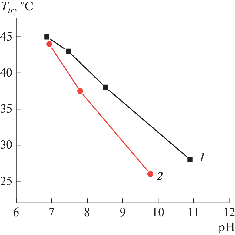 Free-radical copolymerization in bulk has afforded copolymers of N-vinylcaprolactam and N‑vinylimidazole (40–60 mol %). Thermosensitive behavior of aqueous solutions of the copolymers has been probed over wide pH range by means of dynamic and static light scattering as well as high-sensitivity differential scanning calorimetry. Three regions of thermally induced conformational behavior have been observed with the change in the medium pH from the alkaline to acidic: phase separation region (I), region of the conformational transition into the mesoglobules state (II), and region of stable molecular solution of the poly-electrolyte (III). Significant polyelectrolyte effects have been revealed for the salt-free solutions of the copolymers, reflected in the presence of fast and slow diffusion modes in the relaxation time distributions. Moderate increase in the ionic strength with the addition of the low-molecular salt has led to shielding of the polyelectrolyte effects, yet the pH-dependent regions of the conformational behavior have not been affected much. The existence of different types of the thermally induced conformational behavior depending on pH has been explained by the balance between hydrophobic interactions involving the N-vinylcaprolactam units and electrostatic interactions of the weakly basic N-vinylimidazole units.