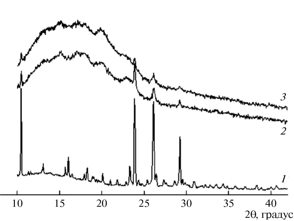 Рис. 2. Дифрактограммы ацикловира (1), смеси крахмал–КМЦ–ацикловир до (2) и после (3) обработки в экструдере