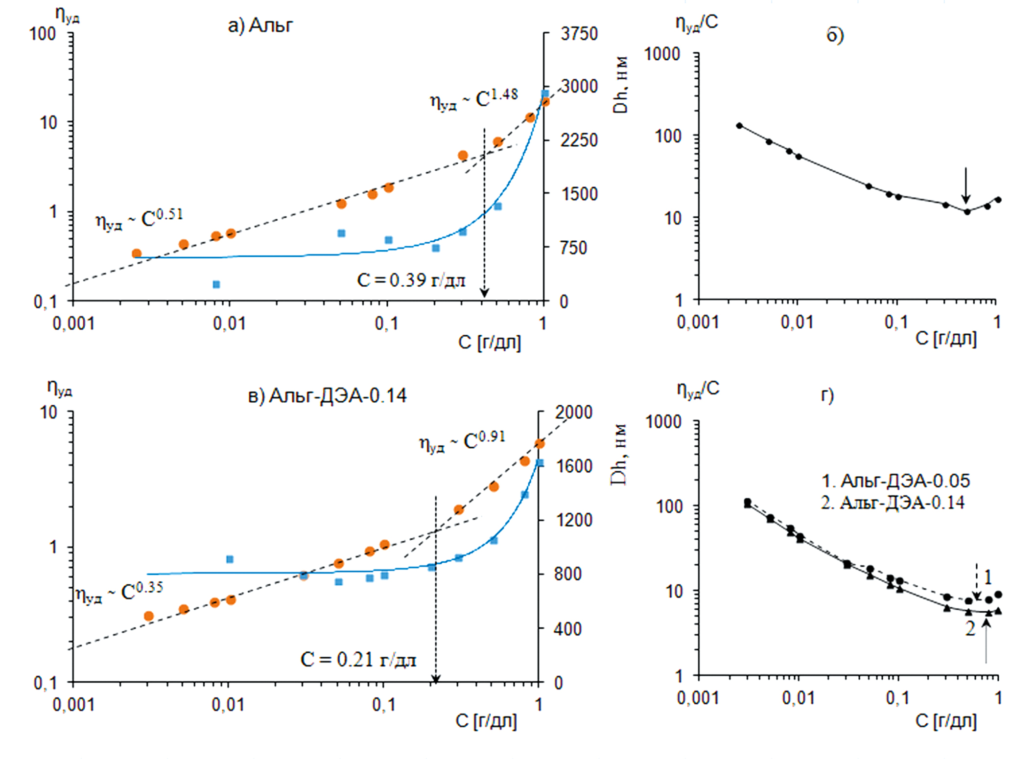 Зависимости ηпр–С в билогарифмических координатах (рис. 3б, 3г) имеют монотонный вид при низких концентрациях и выраженный минимум в области С = 0.5 г/дл. Наличие такого минимума свидетельствует о переходе в область концентрированных растворов. Выше этой концентрации формируются зацепления между макромолекулами, что отражает наблюдаемое резкое повышение гидродинамического диаметра агрегатов. Полученные результаты указывают на то, что исследованный диапазон концентраций исходного и ДЭА-модифицированных альгинатных полимеров лежит между С*-Ce, т.е. в области полуразбавленных растворов без зацеплений. Данная область концентраций выше точки кроссовера характеризуется ориентационным порядком с формированием микродоменной структуры, стабилизированной диполь-дипольными взаимодействиями [31]. Найденные критические концентрации альгиновых полимеров С = Сe соответствуют переходу в область растворов с зацеплениями.