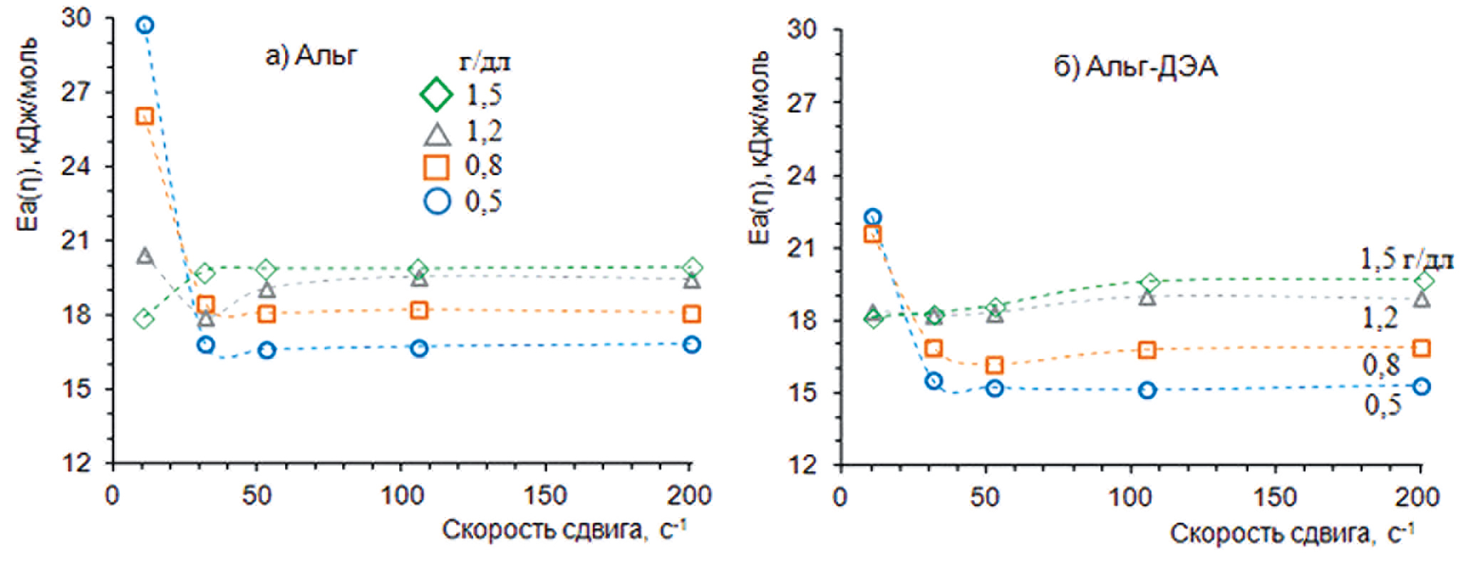 Для раствора исходного альгината натрия с концентрацией 1.5 г/дл при низких скоростях сдвига наблюдается небольшой рост ∆Ea(η), затем, при скоростях сдвига от 52 до 200 с–1 выход на плато с ∆Ea(η), близкой к 20 кДж/моль (рис. 4а, табл. П1а Приложения). Зависимости для растворов Альг-ДЭА с концентрацией 1.2 и 1.5 г/дл имеют схожий характер с минимальным значением ∆Ea(η) в области скоростей сдвига до 52 с–1 (18.5 кДж/моль). Выше 52 с–1 происходит рост ∆Ea(η) до 19 кДж/моль (рис. 4б). В целом полученные значения ∆Ea(η) сравнительно низки и близки к энергии активации вязкого течения растворителя.