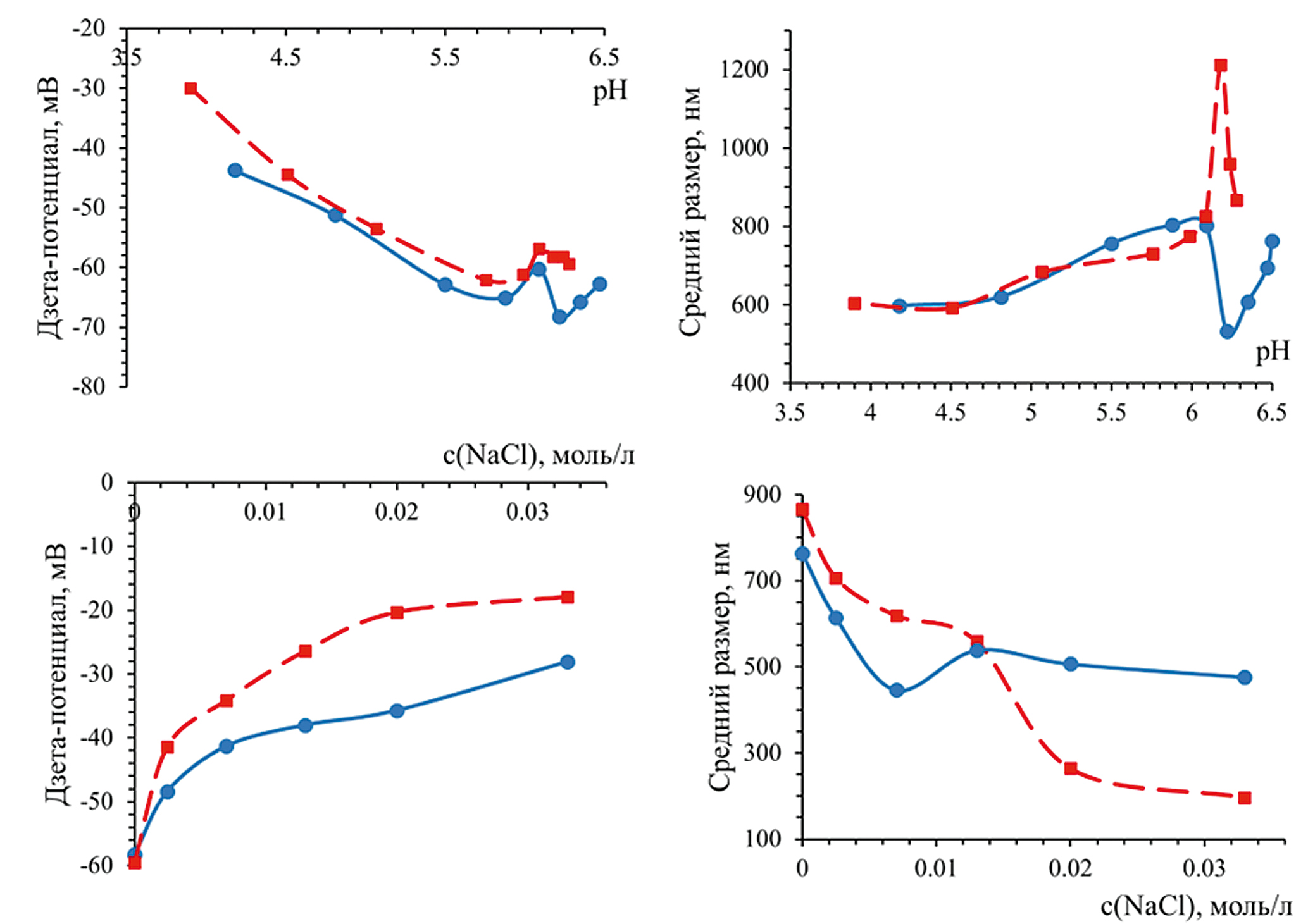 Как было показано в предыдущем разделе, в водной среде молекулы исследуемых полиэлектролитов образуют устойчивые агрегаты за счет водородных связей между кислотно-основными центрами молекулы. На рис. 6 представлены дзета-потенциал и размер образующихся частиц в зависимости от рН для исходного альгината натрия и его производного Альг-ДЭА-0.14 в области разбавленных растворов.