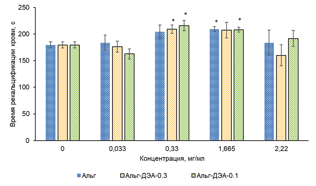 Влияние образцов на время свертывания цельной крови человека в тесте времени рекальцификации крови оценивали как описано G.L. Gulliani с соавторами [13]: к 0.1 мл цитратной крови, содержащей образцы Альг-ДЭА (0.033–2.220 мг/мл), добавляли 0.1 мл раствора 0.02 М CaCl2 и фиксировали время появления сгустка.