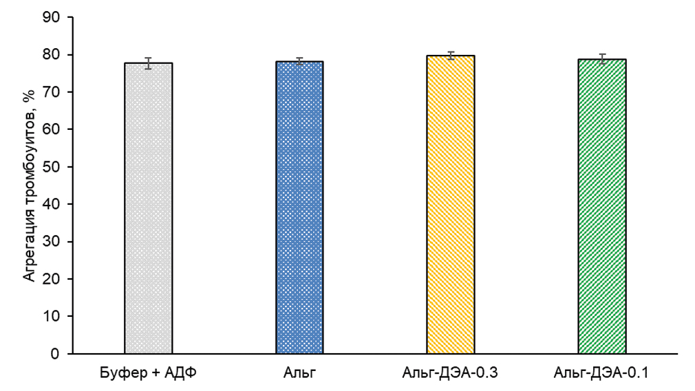 Для оценки гемосовместимости in vitro образцов Альг-ДЭА использовали тесты времени рекальцификации крови и АЧТВ и анализ влияния на агрегацию тромбоцитов [10, 11]. Добавление образцов альгината натрия, Альг-ДЭА-0.3 и Альг-ДЭА-0.1 к крови в концентрациях 0.033 мг/мл и 2.22 мг/мл не приводило к достоверному изменению времени свертывания в тесте времени рекальцификации крови (162.64 ± 9.29 – 191.69 ± 14.87 с) посравнению с контролем при добавлении буферного раствора (179.63 ± 5.75 с) (рис. 7). Инкубация крови с образцами альгината натрия, Альг-ДЭА-0.3 и Альг-ДЭА-0.1 в концентрациях 0.33 мг/мл и 1.665 мг/мл приводила к достоверному, но незначительному (в 1.14–1.20 раза) увеличению времени свертывания крови по сравнению с контролем.