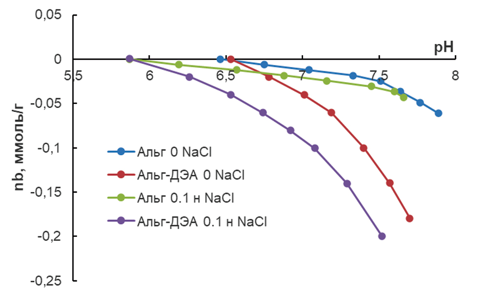 На рис. 5 представлена величина адсорбции протонов nb в зависимости от рН и концентрации фонового электролита для водных растворов альгината натрия и его производного Альг-ДЭА. Смещение кривых титрования альгината натрия и его амид/аминосодержащего производного Альг-ДЭА в более кислую область при увеличении концентрации фонового электролита можно объяснить участием катионов фонового электролита в нейтрализации депротонированных карбоксильных групп и переходом протонов из пограничного слоя молекулы полиэлектролита в объем раствора [35]. Этот эффект приводит к смещению рКа равновесия –COOH ↔ –COO– + H+ c 4.1 ± 0.15 (без фонового электролита) до 3.50 ± 0.15 (при концентрации фонового электролита 0.1 н).
