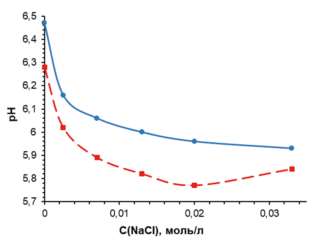 Также необходимо учитывать, что катион натрия не связан ковалентно с отрицательно заряженной карбоксильной группой альгината натрия, поэтому важным параметром, влияющим на кислотно-основные равновесия, будет ионная сила [37-39]. Ионы фонового электролита оказывают влияние на нейтрализацию депротонированных карбоксильных групп и способствуют переходу избытка протонов из приграничного слоя в объем раствора, что приводит к снижению рН системы [35]. Например, в 0.1 н растворе NaCl для альгината натрия значение pKa составляет 3.5 [40].