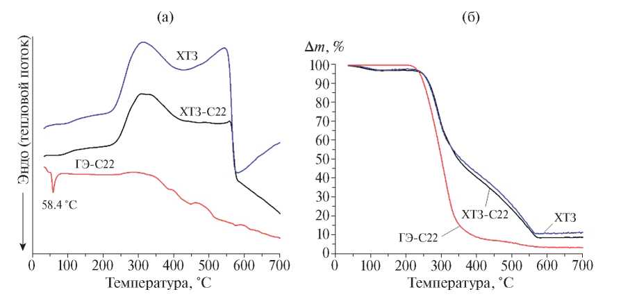 Рис. 1. Кривые ДСК (а) и ТГА (б) для ГЭ-С22, хитозана (ХТЗ) и ХТЗ-С22. Атмосфера – воздух. Цветные рисунки можно посмотреть в электронной версии.