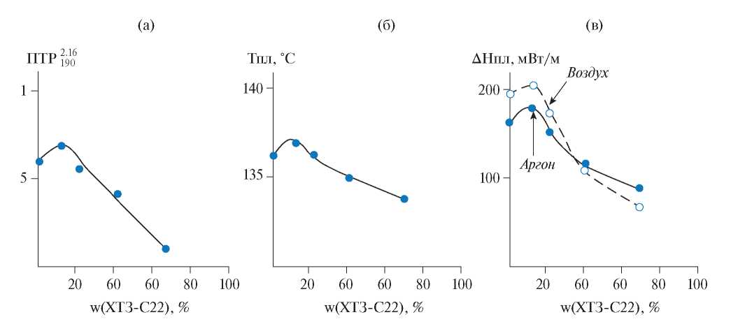 На рис. 4 представлены зависимости показателя текучести расплава ПТР2.16190, температуры пика плавления и энтальпии плавления композитов от массовой доли Х-С22 в образцах ПЭНД. Повышение температуры плавления и снижение вязкости расплава наблюдаются при массовой доле наполнителя 10–20%.