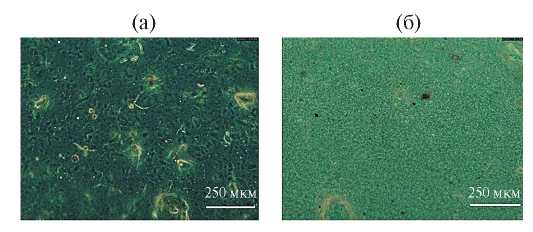Рис. 5. Оптические микрофотографии композитных пленок на основе ПЭНД и Х-С22 (10% (а), 10% после твердофазной экструзии (б)).