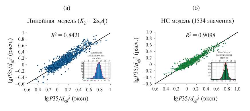 Рис. 6. Сравнение экспериментальных и расчетных значений lgP35 / deff2 для линейной (K2 = ΣxiAi) (а) и нейросетевой (б) моделей. Единицы измерения: P35 – Баррер, deff – ангстремы.