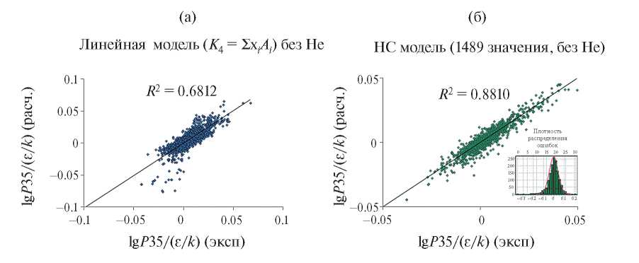 Рис. 7. Сравнение экспериментальных и расчетных значений lgP35 / (ε / k) для линейной (K4 = ΣxiAi) (а) и нейросетевой (б) моделей без He. Единицы измерения: P35 – Баррер, (ε / k) – градусы Кельвина.