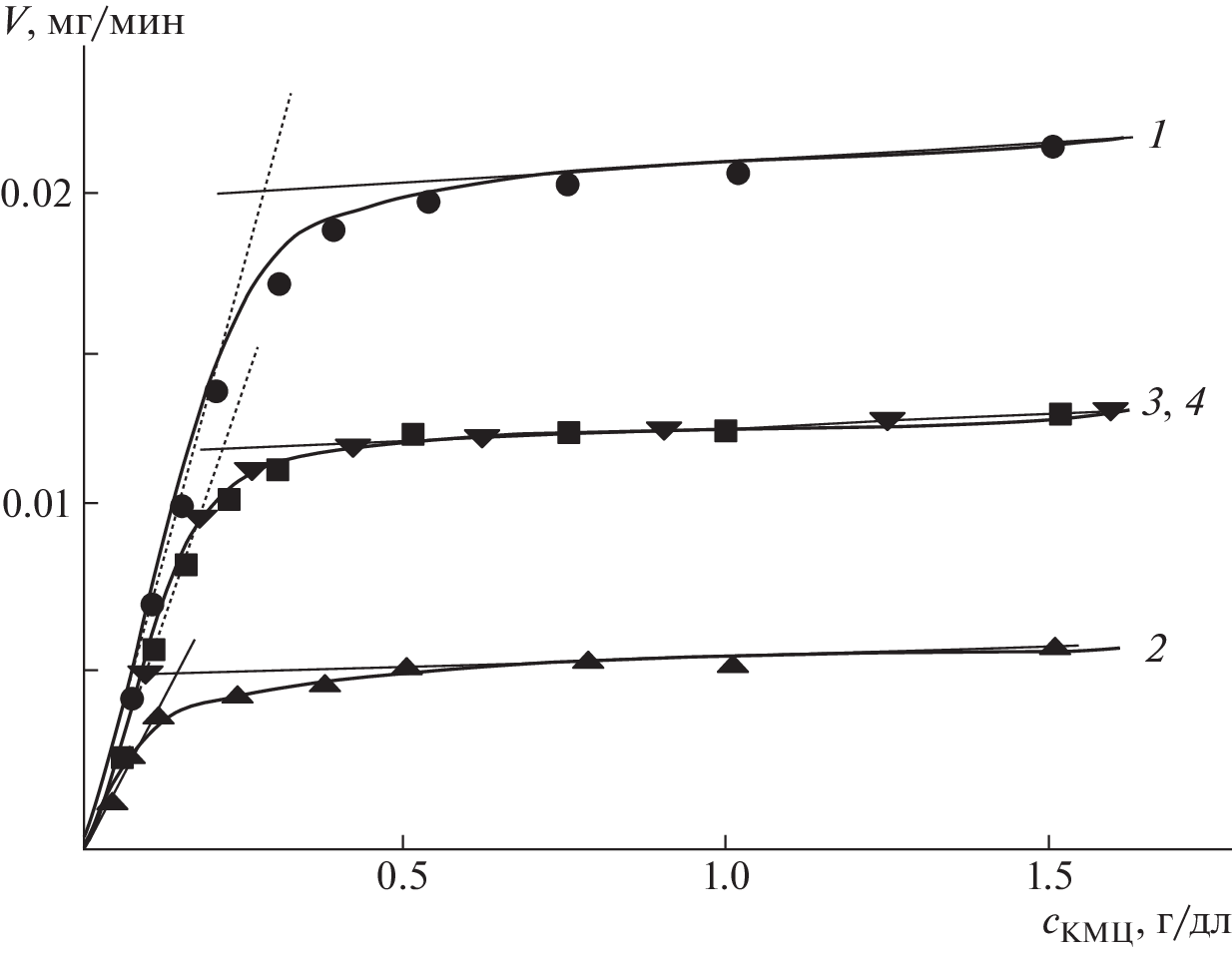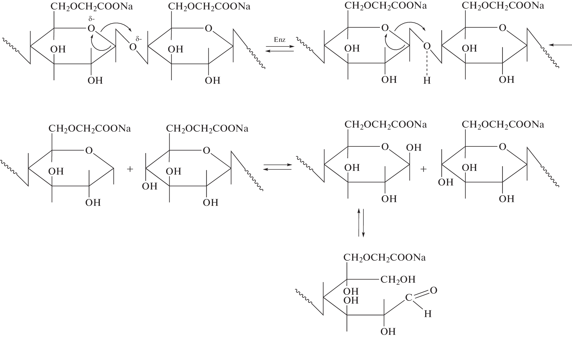 Manifestation of the supramolecular effect in reactions of the enzymatic hydrolysis of sodium carboxymethyl cellulose is studied. The occurrence of enzymatic hydrolysis under the action of nonspecific enzyme hyaluronidase is confirmed by the method of reducing sugars. The supramolecular structure of the polymer in solution is controlled using the approach including the use of cosolvents (modifiers), with a number of alcohols (ethanol, propylene glycol, and glycerol) being used as modifiers. It is shown that as polymer concentration in solution increases above 0.3 g/dL the rate of enzymatic hydrolysis almost ceases to raise with increasing concentration. This finding is associated with diffusion hindrances arising in interaction of the polymer with the enzyme due to an increase in the degree of aggregation of macromolecules in solution and formation of the entanglement network. In the presence of the modifiers in solution, the rate of enzymatic hydrolysis slows down. This effect can be explained by several factors: first, a decrease in the sizes of the macromolecular coil and an earlier formation of the entanglement network and, as a consequence, reduction in the accessibility of polymer units for interaction with the enzyme. Second, the modifying additives decrease the total β-glycosidase activity of hyaluronidase. It is demonstrated that the features of enzymatic hydrolysis in solution persist in the case of film samples.