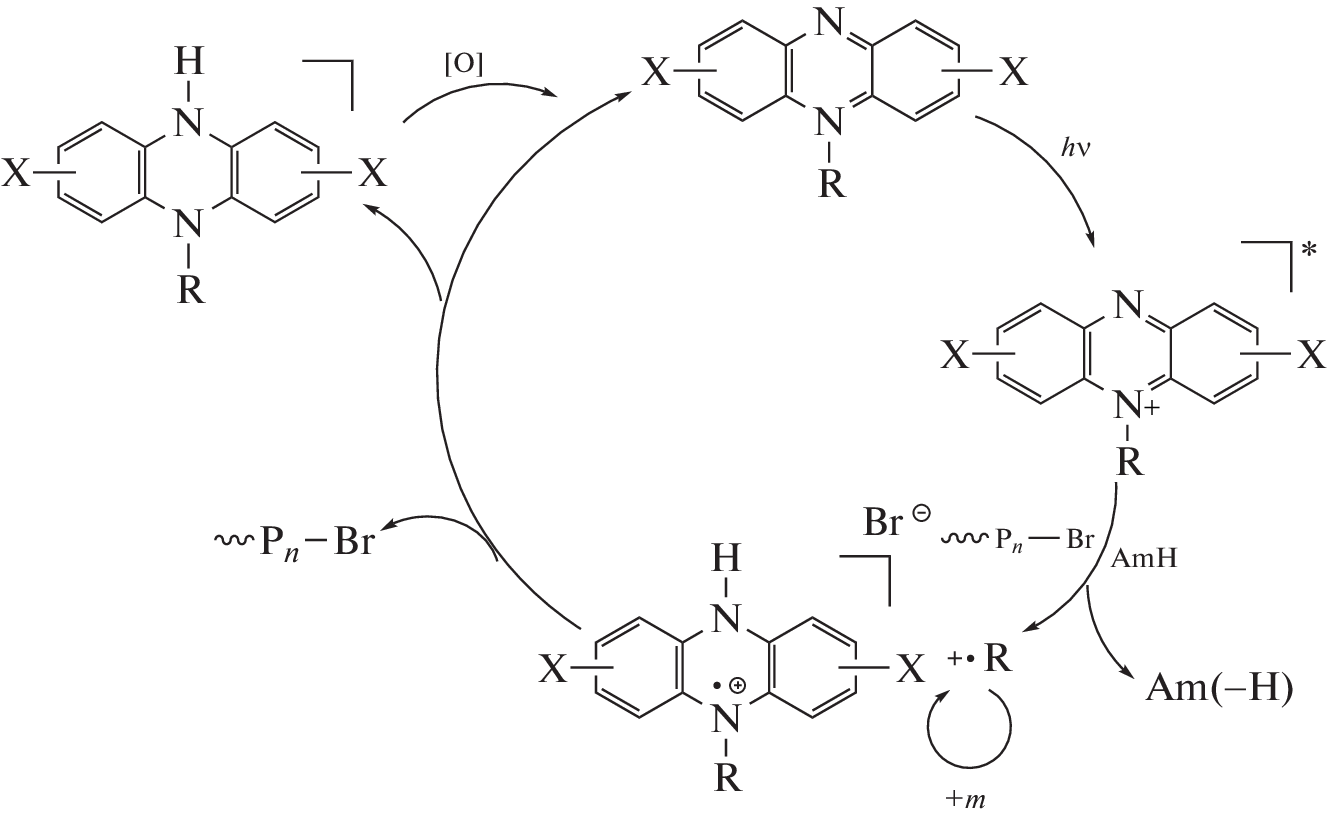 Features of the polymerization of methyl methacrylate and a number of other (meth)acrylate monomers in the presence of catalytic systems based on phenazine dyes (Neutral Red and Safranin Т) under visible light irradiation are investigated. It is shown that amines of various structure as well as air oxygen affect the kinetic features of polymerization and the molecular weight characteristics of polymers. It is found that polymerization may proceed in the controlled mode up to high conversions at room temperature and a low photocatalyst concentration, among them without preliminary degassing of the reaction medium.