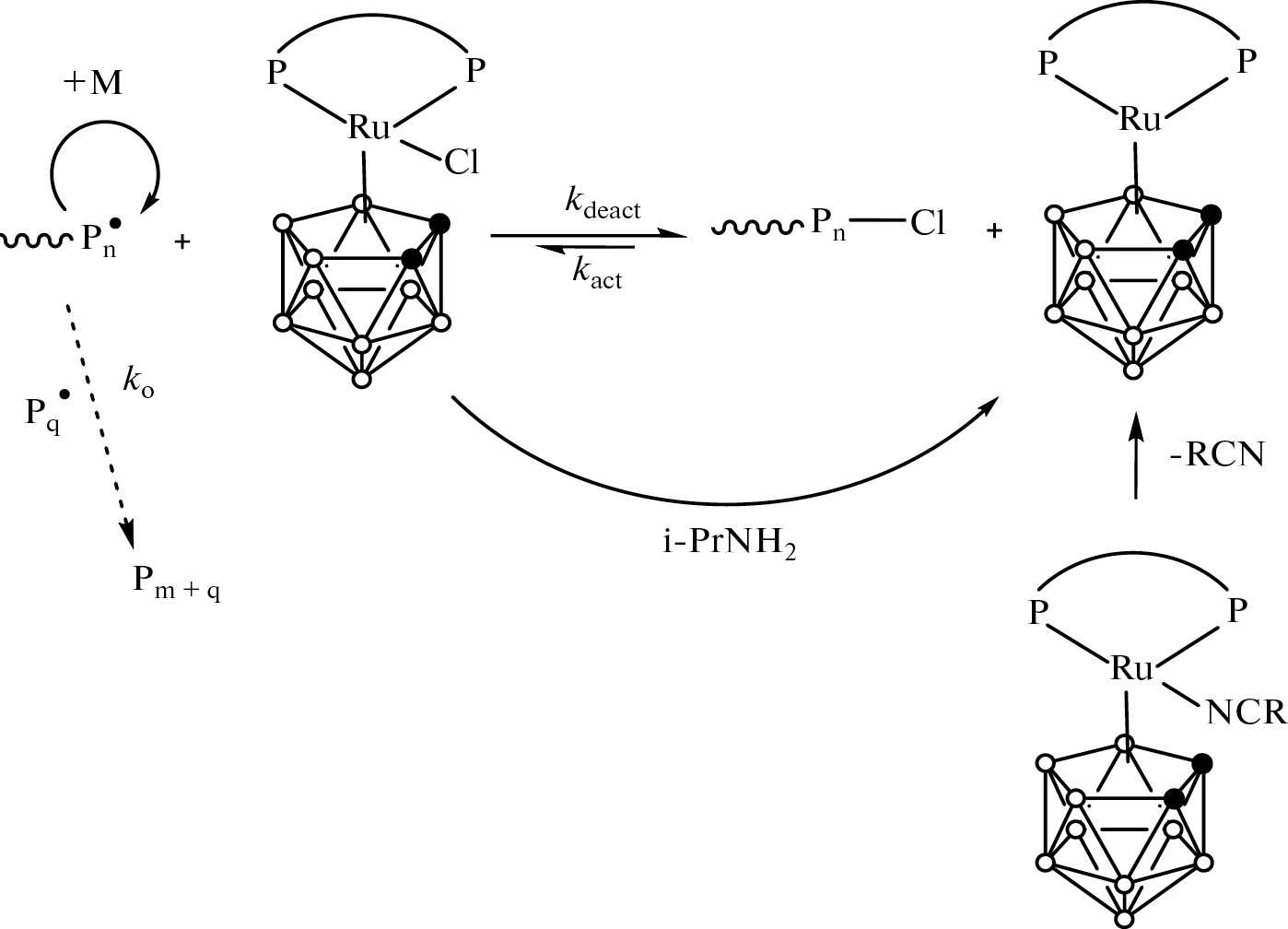 Радикальная полимеризация по механизму с переносом атома может быть реализована как в традиционном, термически-инициированном процессе [6], так и в условиях фотооблучения при использовании комплексов переходных металлов в качестве катализаторов [7, 8]. Часто для этих целей используют комплексы меди [6, 9–11], рутения [12–14], железа [15–17], иридия [7, 18] с различными лигандами. Для эффективного регулирования роста цепи, приводящего к образованию гомои сополимеров с низкими значениями дисперсности, к металлокомплексному катализатору предъявляется ряд требований. Прежде всего, переходный металл должен иметь по крайней мере две смежные степени окисления, а его координационная сфера должна иметь способность увеличиваться для селективного размещения галогена. Среди соединений, отвечающих указанным требованиям, следует выделить карборановые комплексы рутения. Благодаря своей стабильности в условиях процесса рутенакарбораны показали высокую эффективность при их применении в качестве катализаторов полимеризации по механизму с переносом атома даже при использовании в концентрации 0.01 мол. % [19].