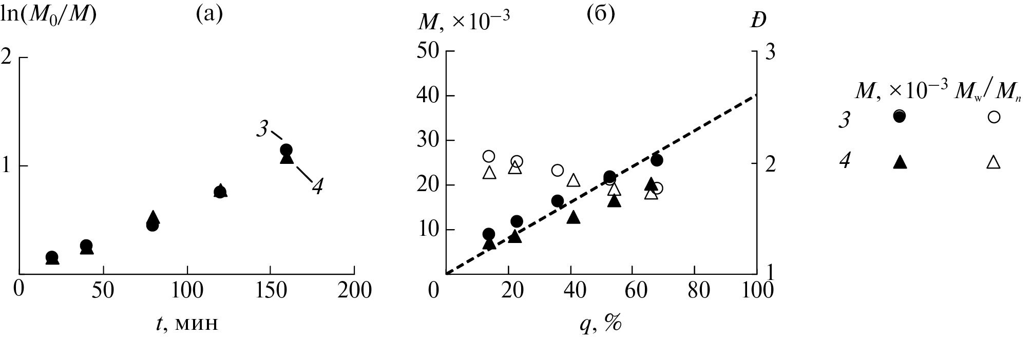 Рис. 2. Кинетические зависимости (а) и зависимости молекулярно-массовых характеристик полученных полимеров от конверсии (б) при полимеризации ММА при под действием каталитической системы на основе комплексов 3 (кружки) и 4 (треугольники) в присутствии 25 об. % толуола. Темные точки – М × 10–3, светлые – Ɖ; [MMA] : : [CCl4] : [Ru] : [i-PrNH2] = 10000 : 25 : 1 : 40. Т = 80°С. Пунктирная линия – теоретически рассчитанное значение молекулярной массы.