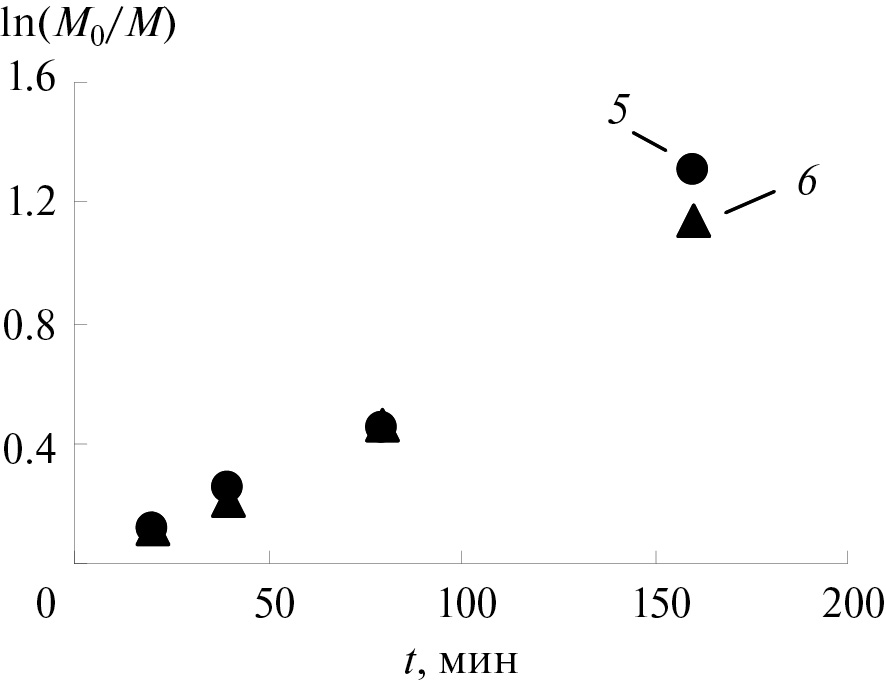 Полимеризация ММА в присутствии соединений 5 и 6, представляющих собой комплексы с лигандом dpePhos, также протекает практически с одинаковой скоростью. Для процесса характерна и линейная кинетическая зависимость в полулогарифмических координатах (рис. 3), однако в отличие от рассмотренных выше комплексов 1–4 контроль над ММР получаемых образцов полимера отсутствует.