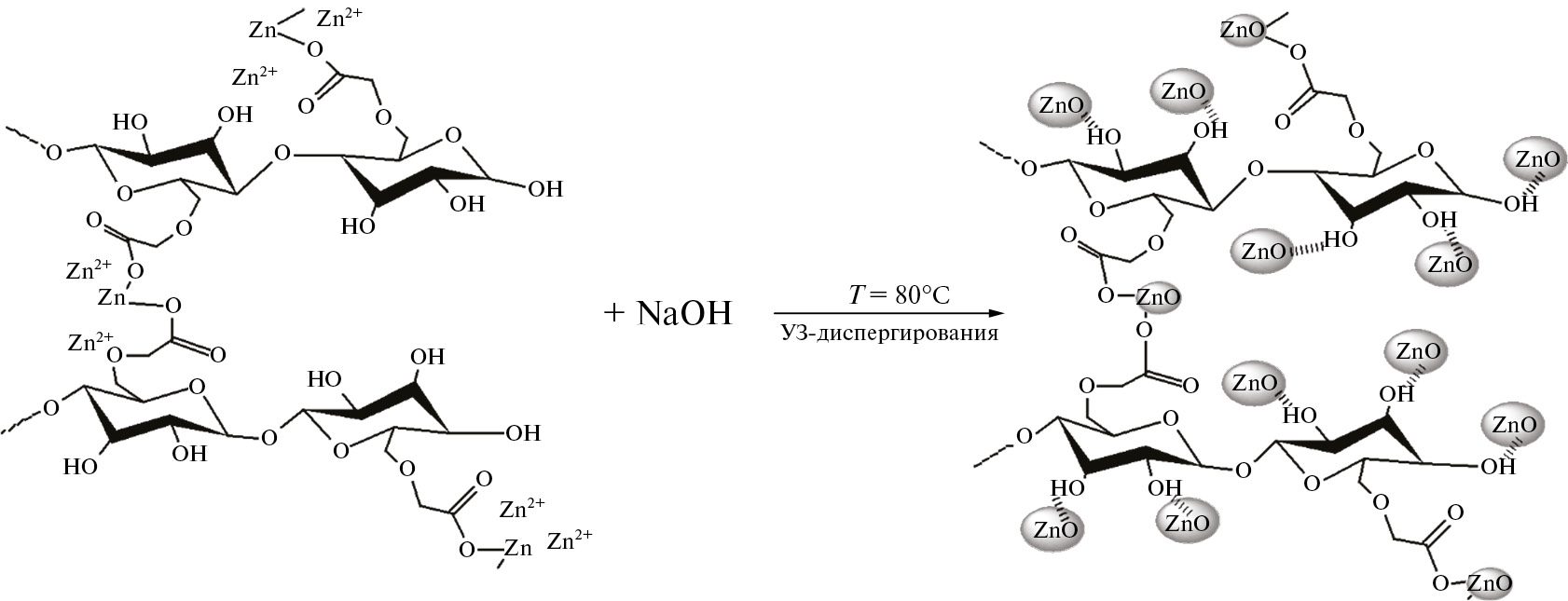 Для контроля размера наночастиц ZnO, появляющихся в гидрогелях Na-КМЦ, и обеспечения их однородности систему Na-КМЦ‒ZnO обрабатывали в ультразвуковом диспергаторе при 44 кГц в течение 20 мин. Предполагаемый механизм образования Na-КМЦ‒ZnO из системы Na-КМЦ‒Zn2+ УЗ-диспергированием показан ниже: