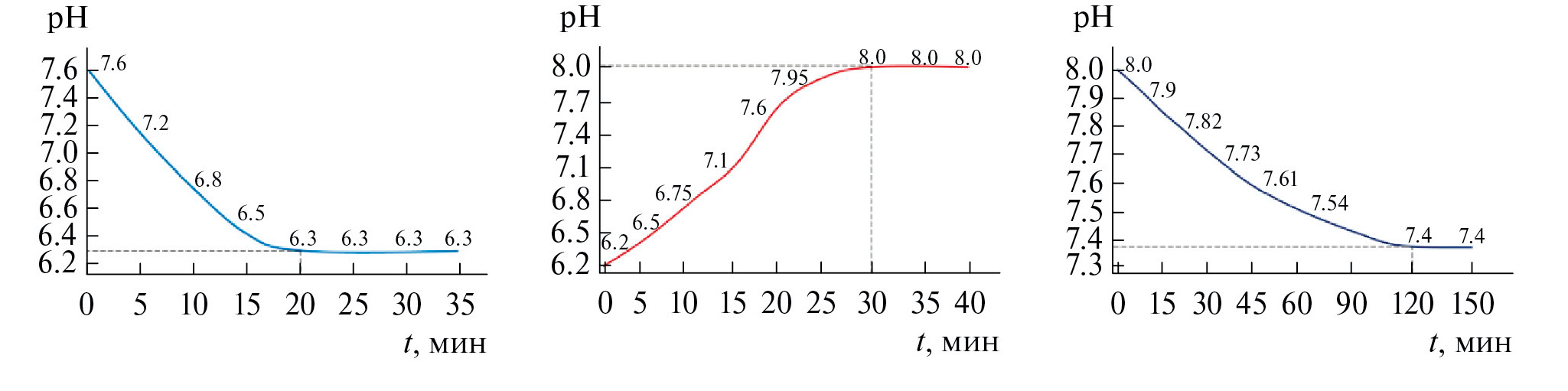 Рис. 1. Влияние времени синтеза на рН среды при образовании наночастиц ZnO в растворах Na-КМЦ: а – Zn2-КМЦ, 25 мин, pH снижается до 6.37; б – Zn(OH)2, 30 мин, pH доходит до 8.02; в – ZnO, 120 мин, рН снижается до 7.45. Пояснения в тексте.