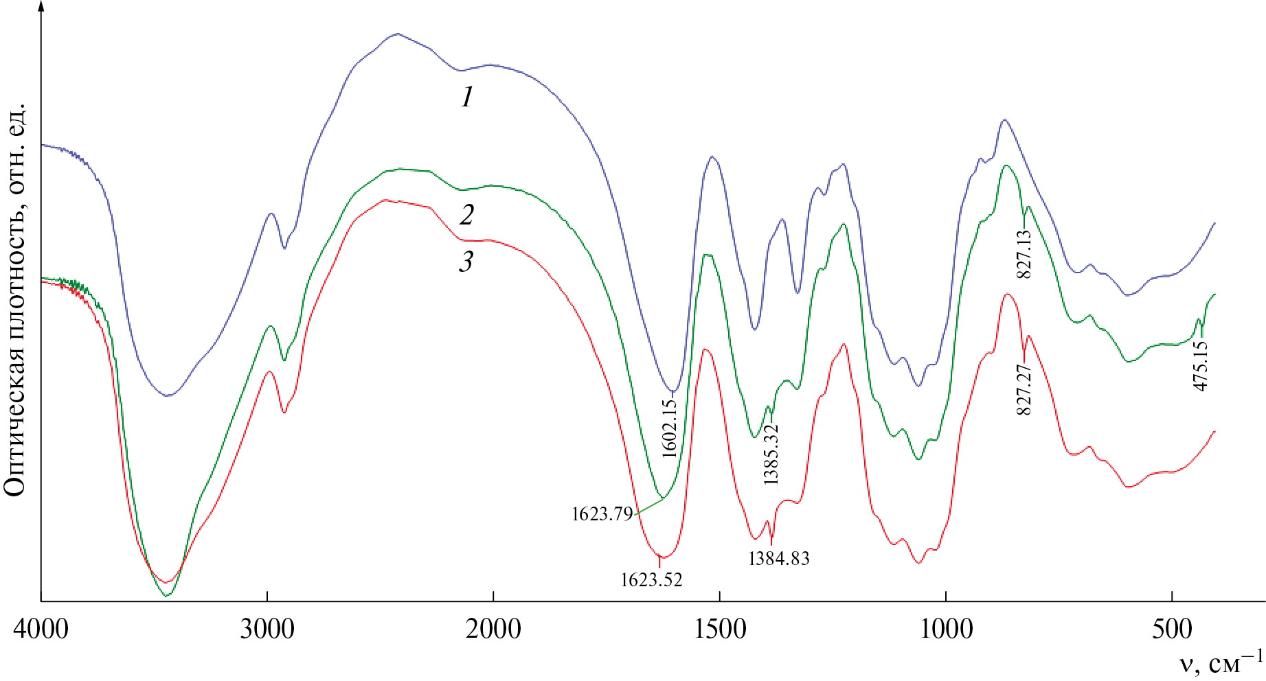 Рис. 2. ИК-фурье-спектры образцов, очищенных Na-КМЦ (1) и Na-КМЦ с содержанием ионов цинка (2) и наночастиц ZnO (3).